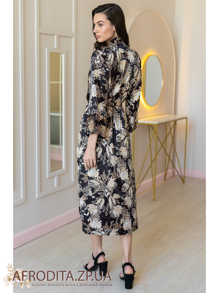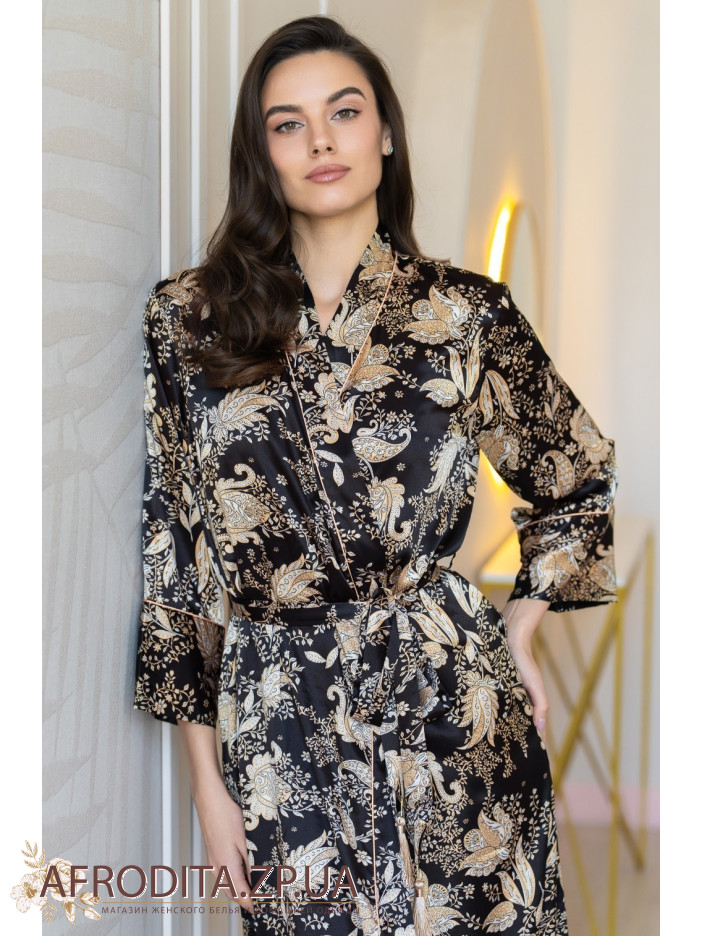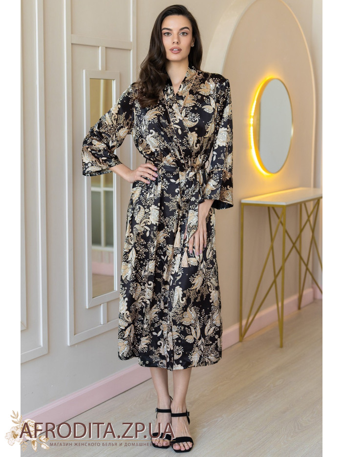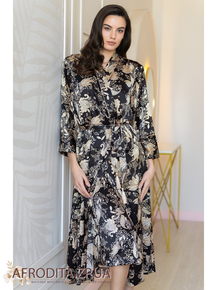 Довгий ароматний халат Ясміна 3989 Mia-Amore виконаний із принтованого сумішевого шовку. Низ рукавів, ланка халата оброблена золотим кантом. Халат заорюється на пояс із золотими декоративними пензликами, у бічних швах є кишені.