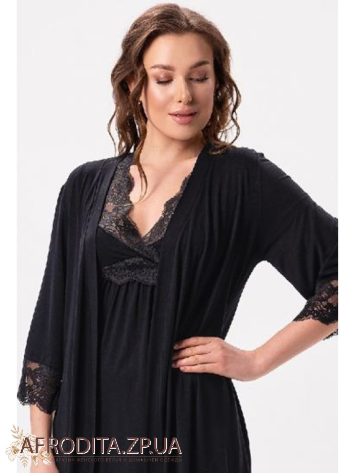 Елегантний жіночий халат Shato з м'якої чорної віскози - ідеальне поєднання комфорту та витонченого стилю. Класичний крій з рукавами 3/4 і довжиною трохи вище колін забезпечує зручність, а запах із поясом красиво підкреслює талію. Ніжні ажурні вставки на рукавах надають образу жіночності. Прекрасний варіант для дому та вишуканий подарунок для близької людини.