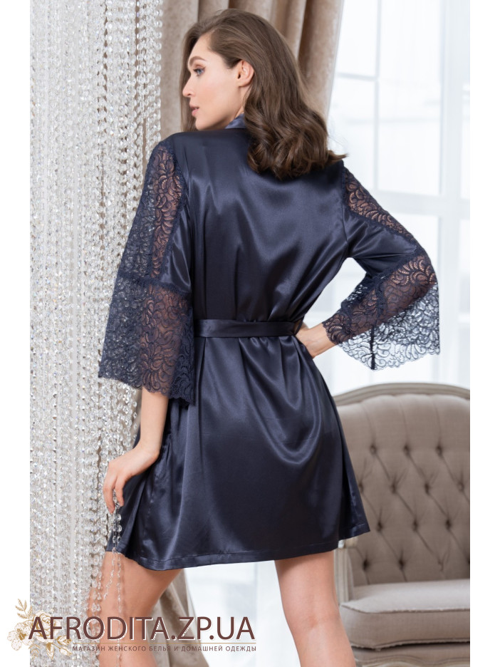 Короткий халат на запах Місті 7263-1 від Mia-Amore із широкими мереживними рукавами завдовжки ¾. Халат виконаний із однотонного штучного шовку. У бічних швах розташовані кишені. Лінія талії підкреслюється завдяки широкому поясу з мереживними вставками на кінцях.