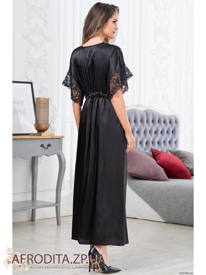 Довгий пеньюар Едіта 3679 Mia-Amore з широким коротким рукавом та кулісою по лінії талії, виконаний із однотонного змішаного шовку. Вставки з французького мережива прикрашають верхню частину бортів та низ рукавів.