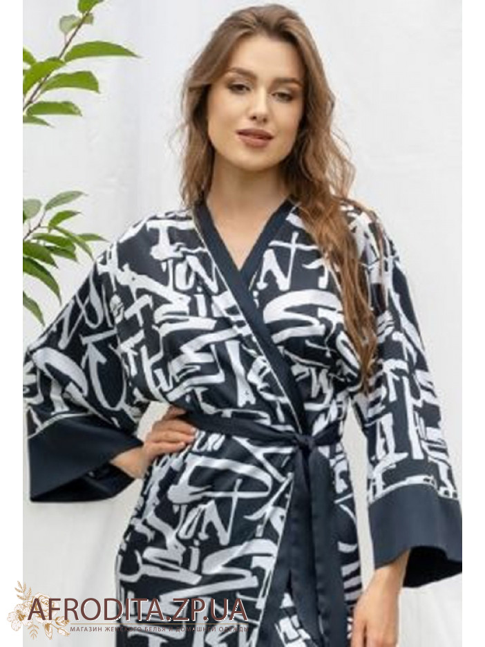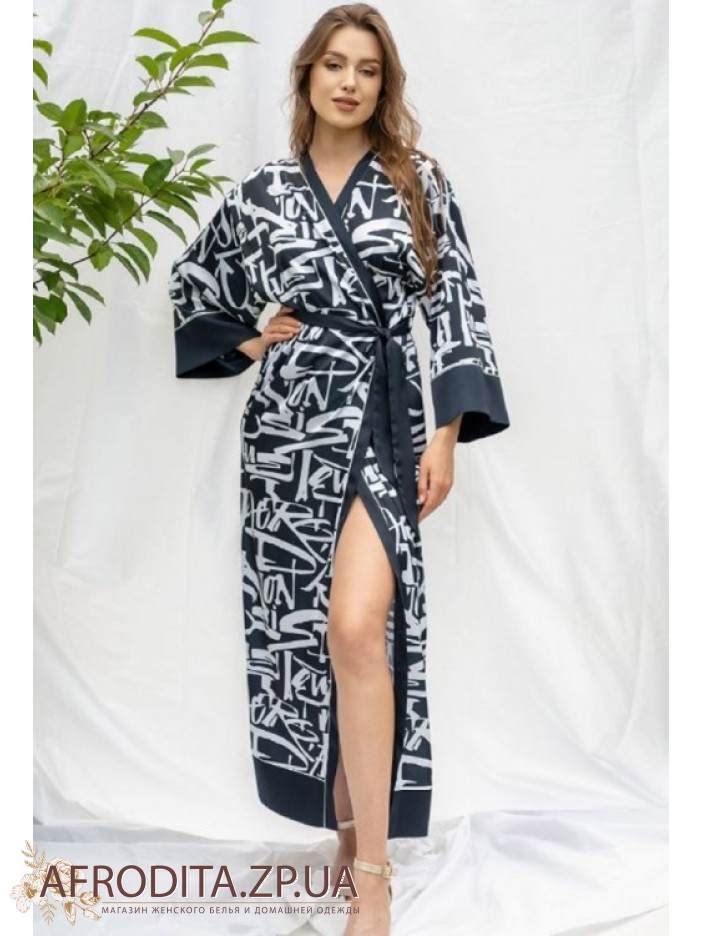 Жіночий довгий халат Shato 2305 із атласного шовку. Халат на запах, рукави і борт виробу декоровані тканиною того виробу. У комплекті додається пояс.