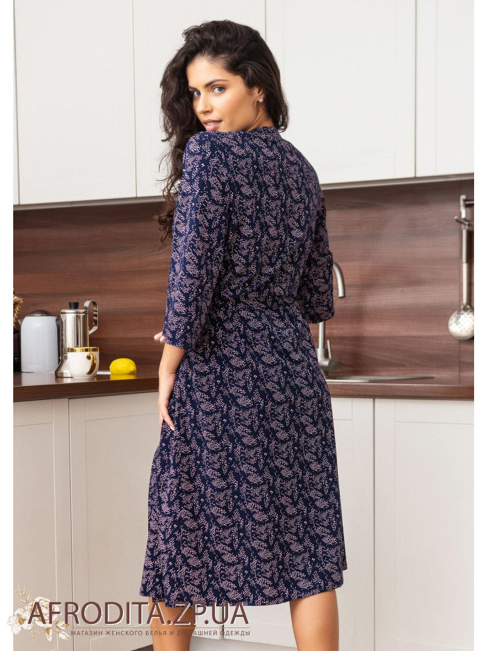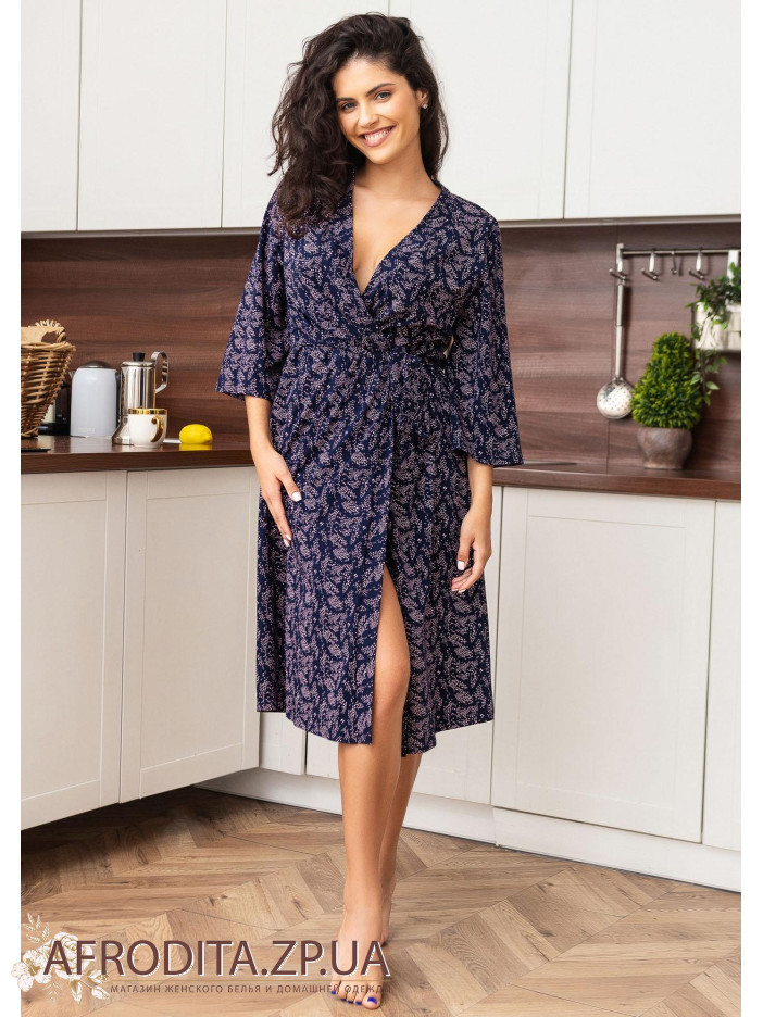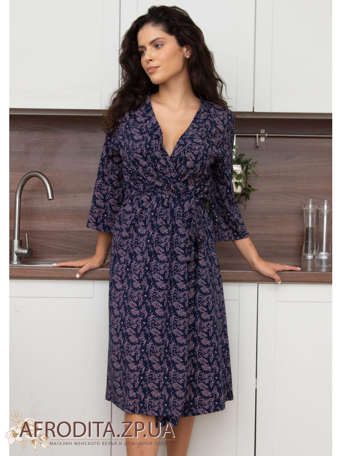 Жіночий домашній халат 1223-16018 темно-синього кольору, виготовлений їх бавовняної тканини. Халат на запах довжиною до колін, рукав 3/4, лінію талії можна регулювати поясом.