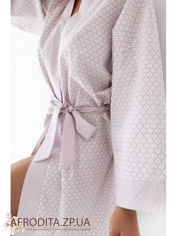 Жіночий халат на запах Sensis Eirlys з натуральної бавовни. Халат вище колін з весняним квітковим принтом та трохи укороченими рукавами. У комплекті додається пояс.
