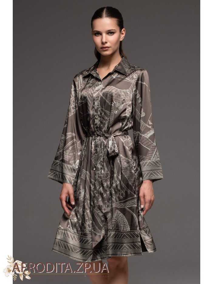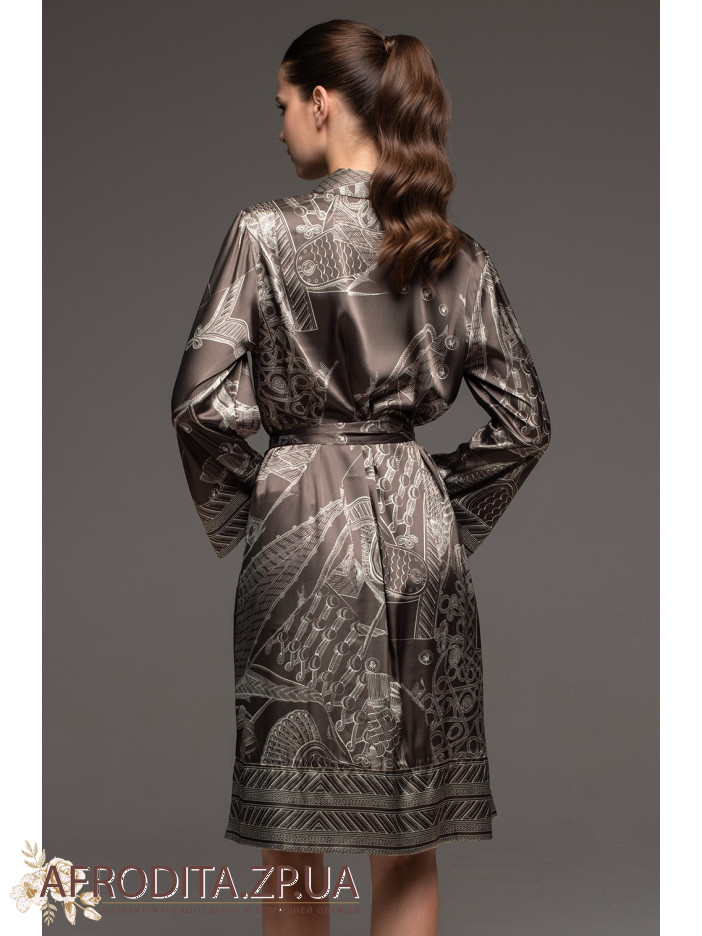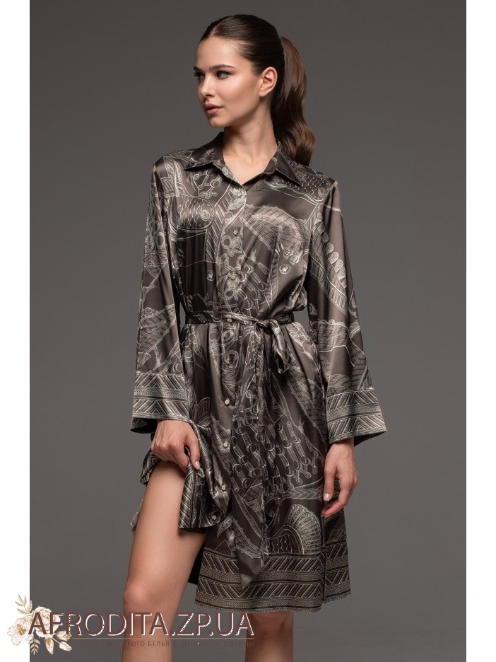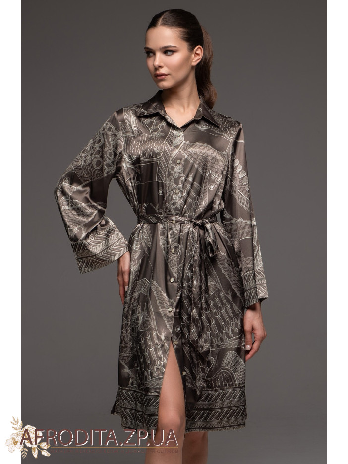 Жіночий шовковий халат на гудзиках Аїша 4327 від Mia-Amore вільного силуету з довгим рукавом. Виріб виконаний із принтованого сумішевого шовку. У бічних швах оброблено кишені. З обох боків розташовані розрізи для свободи руху. Лінію талії можна підкреслити за рахунок широкого поясу, що йде у комплекті.