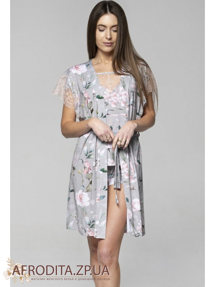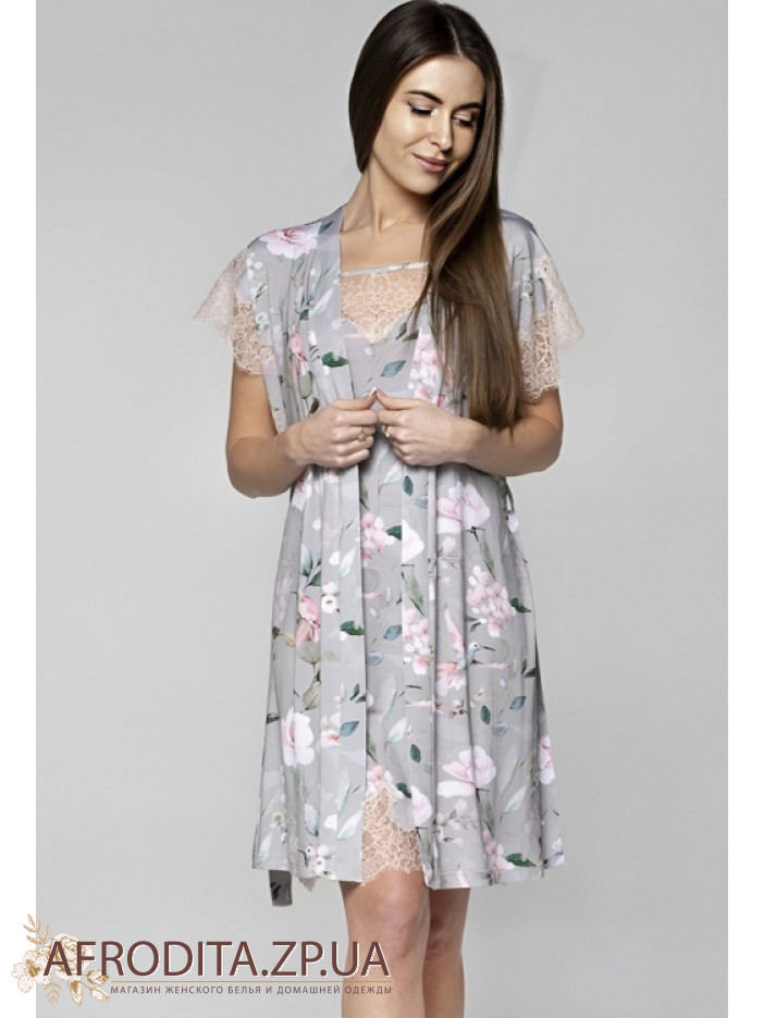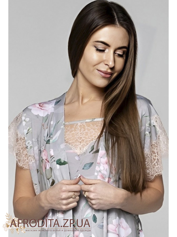 Жіночий халат із віскози Shato 2221/1 від українського бренду. Халат довгий до колін з короткими рукавами з мережива. Халат на запах, лінія талії регулюється поясом.