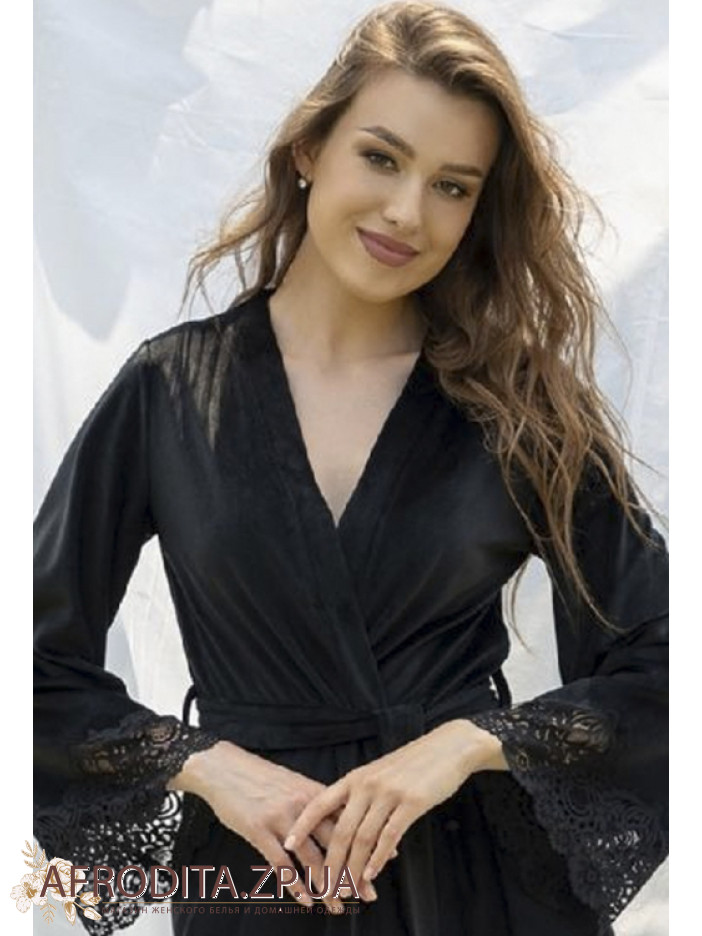 Жіночий велюровий халат Shato 2326 від українського бренду. Халат довжиною вище колін на запах. Краї рукавів та нижня частина виробу декоровані мереживом. У комплекті додається пояс.