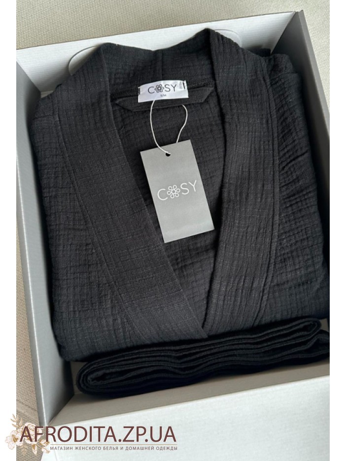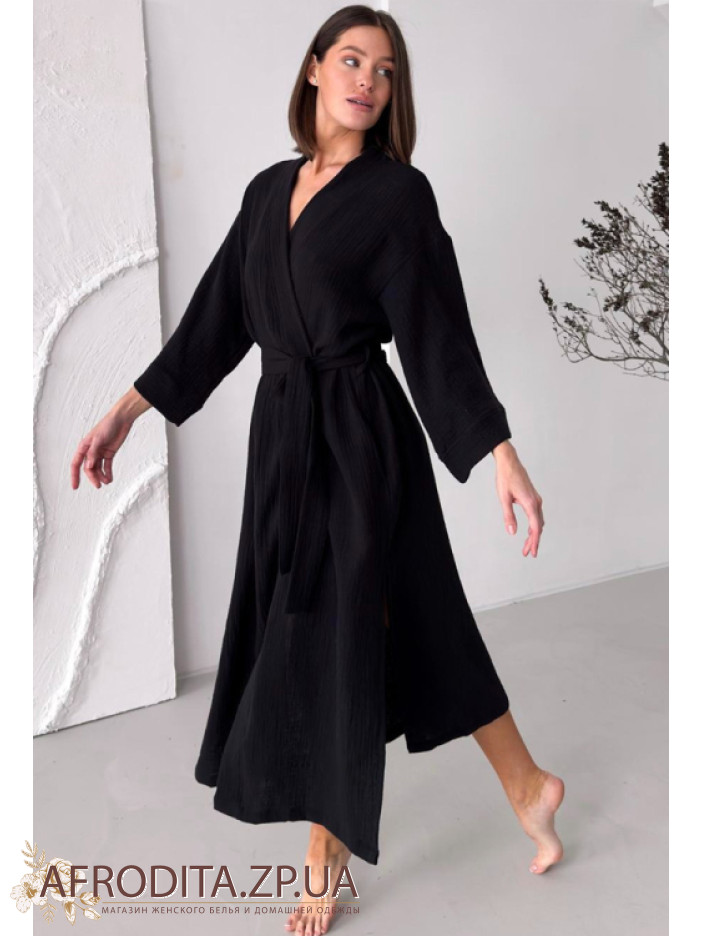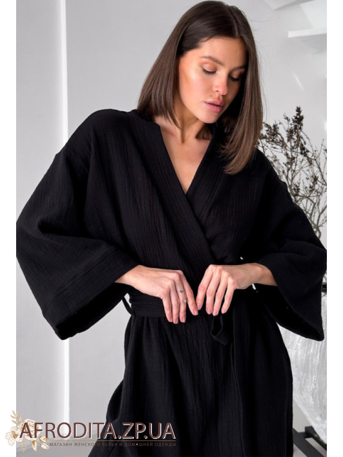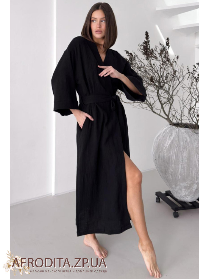 Жіночий халат-кімоно з м'якого та дуже приємного до тіла мусліну від українського бренду Cosy. Халат нижче колін на запах з трохи укороченими рукавами, з боків виробу розташовані кишені. Модель має бічні розрізи. Халатик на запах, в комплекті додається пояс, за допомогою якого можна регулювати лінію талії. Халат дуже приємний до тіла та виглядає елегантно, може бути гарним подарунком для близької людини.