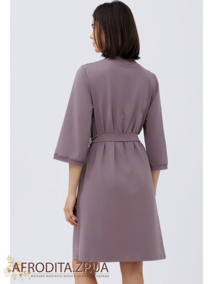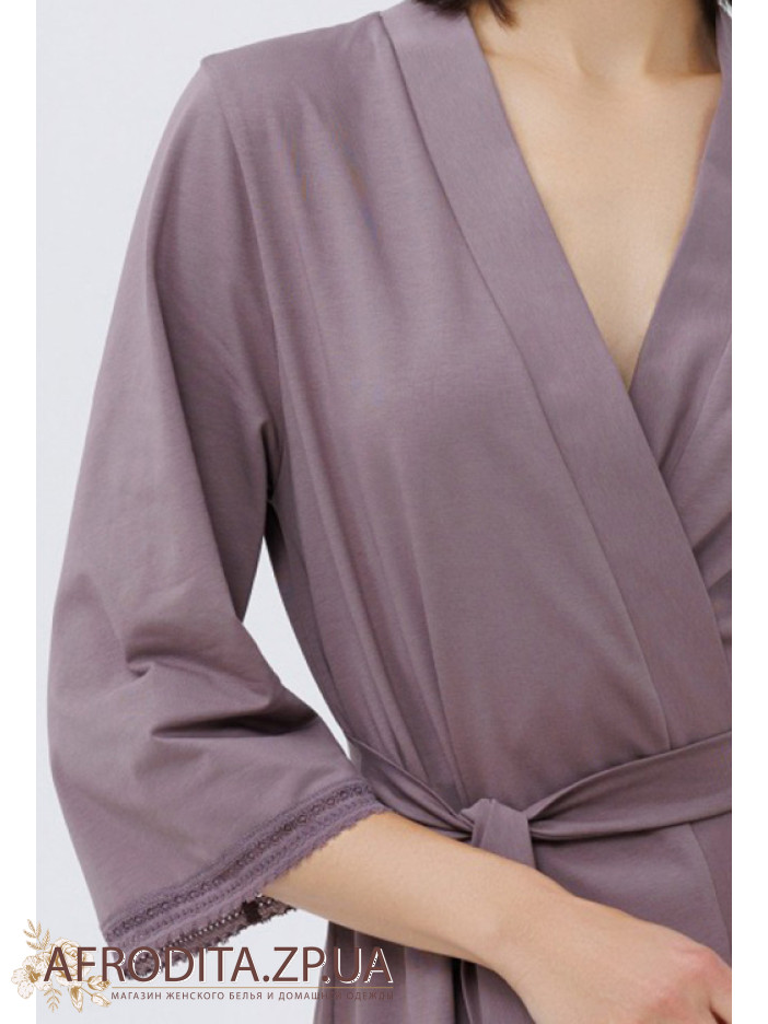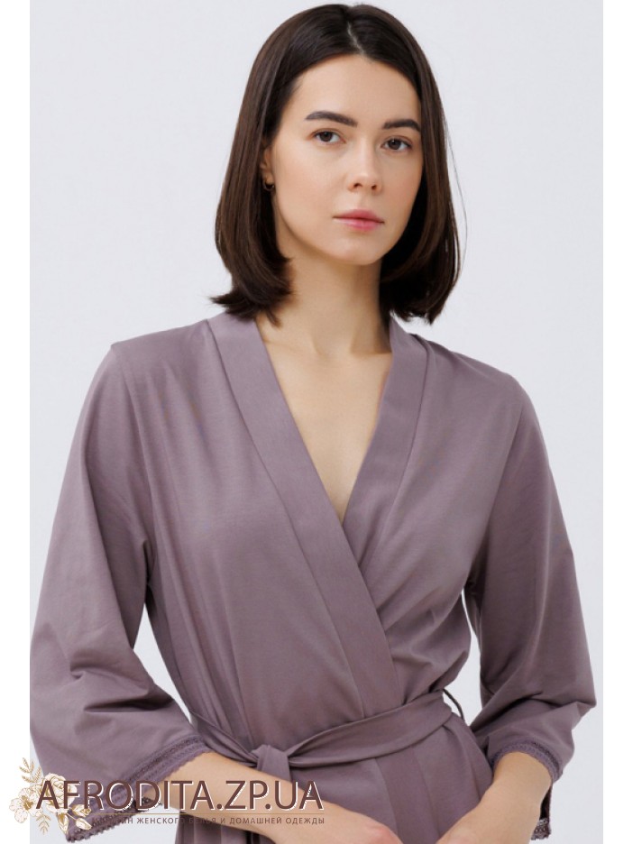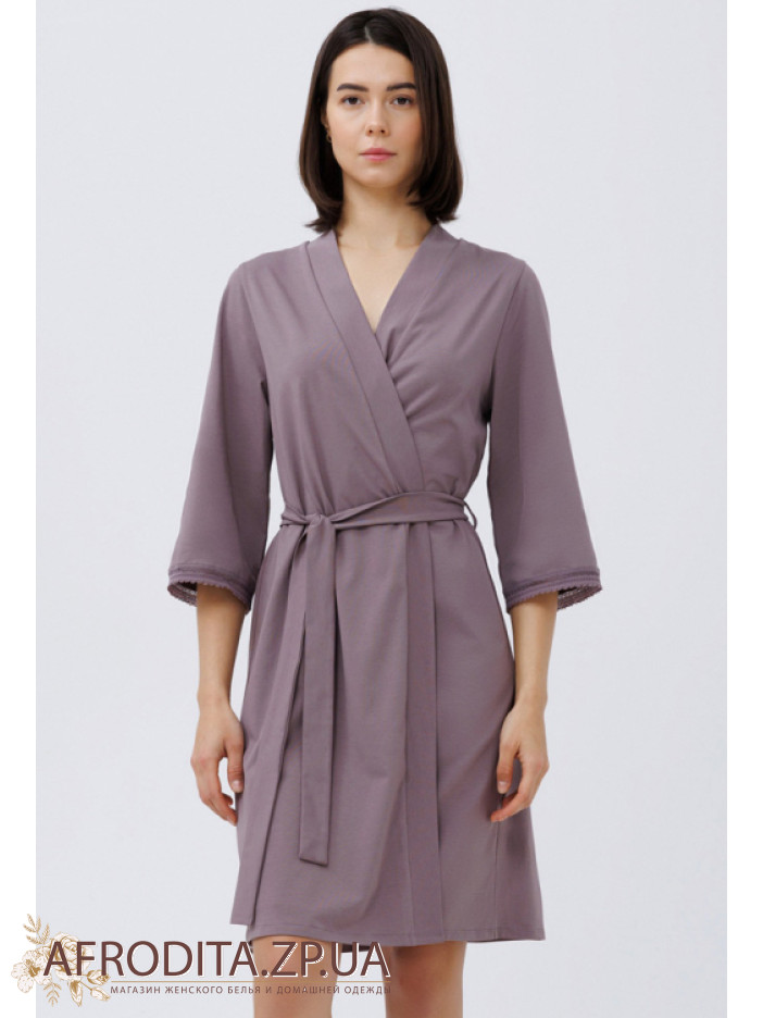 Жіночий халат з бавовни 1563-16681 від Roksana. Модель на запах довжиною вище колін. Довжина рукава 3/4. У комплекті додається пояс для регулювання лінії талії. Краї рукавів декоровані мереживом. Модель дуже практична, м'яка тканина і не викликає роздратування.