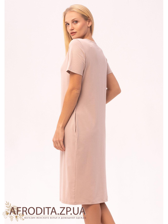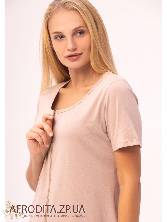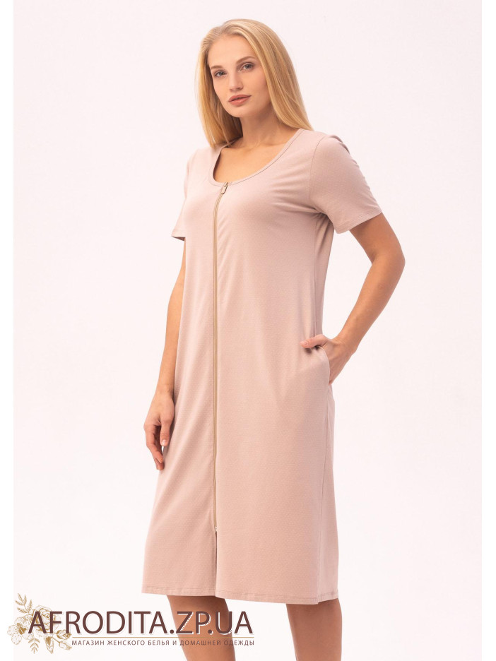 Жіночий халат на блискавці 1372-16305 із однотонної бавовняної тканини бежевого кольору. Халат з округлою горловиною з довжиною нижче колін. Халат застібається на блискавку, з обох боків розташовані кишені.