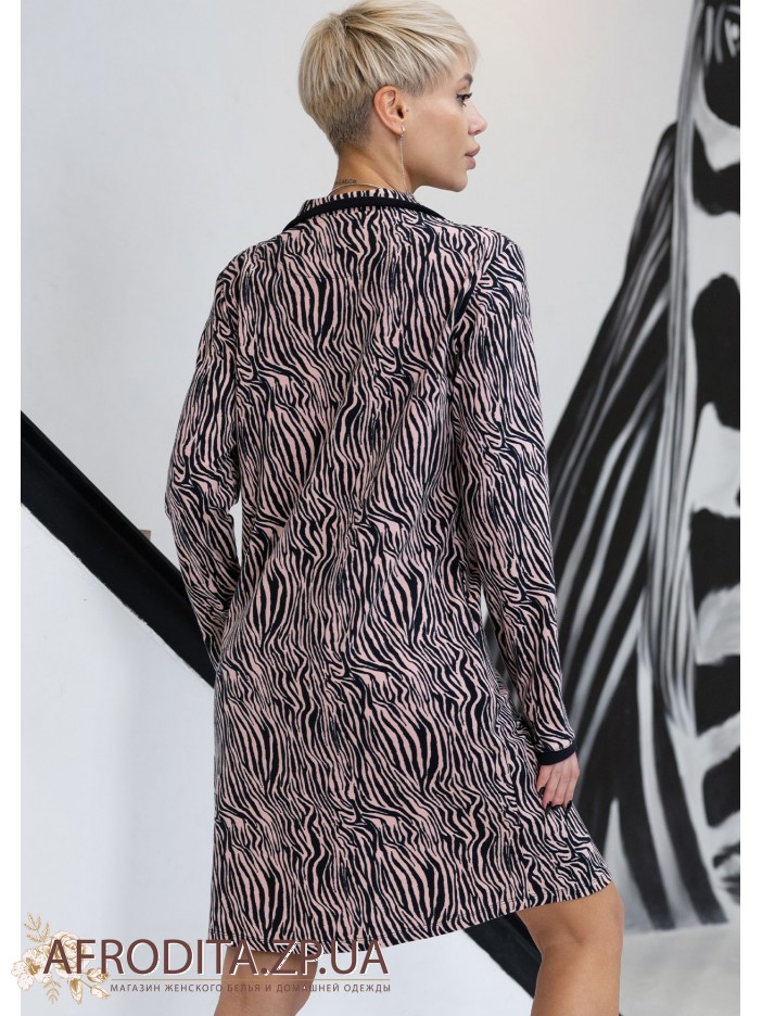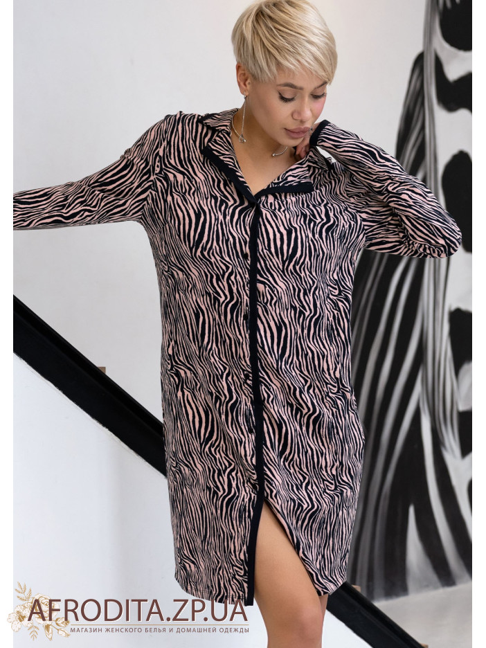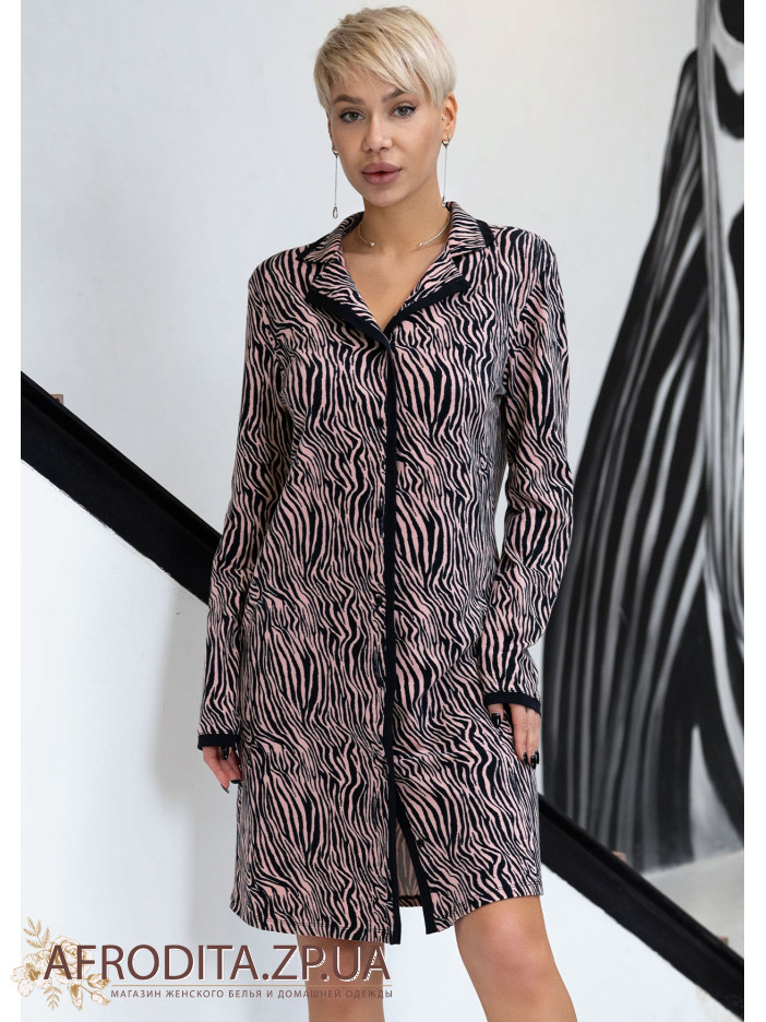 Жіночий халат на гудзиках 1596-16125 в стильному анімалістичному забарвленні з натуральної бавовни. Халат з довгим рукавом та застібається на гудзики. Краї рукавів та борт халата декоровані чорним кантом.