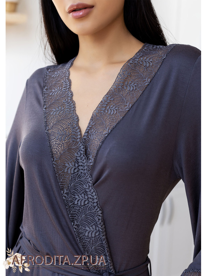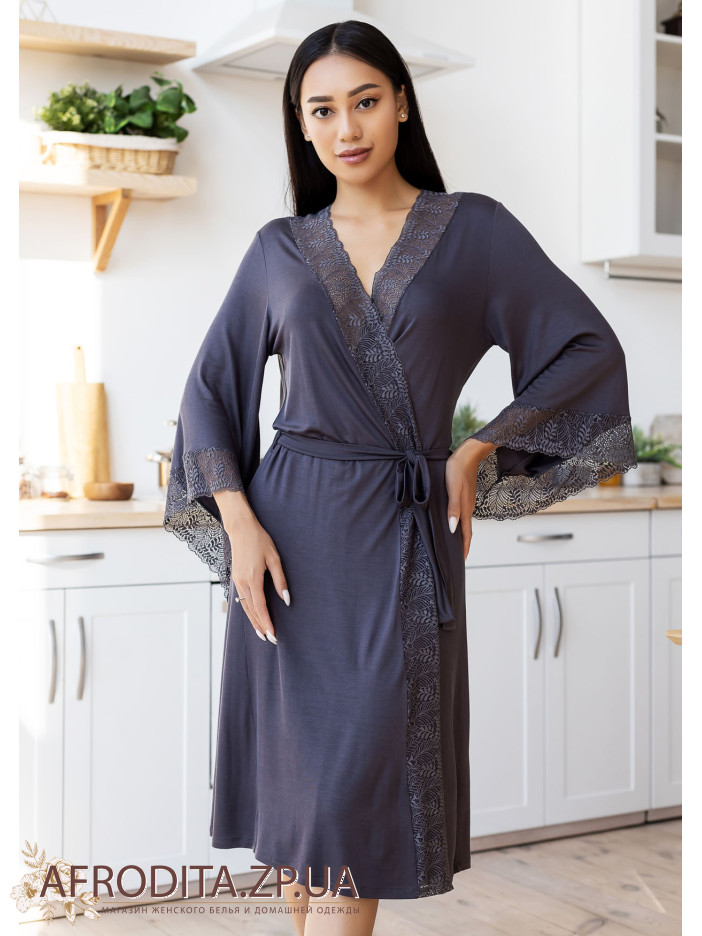 Жіночий халат на запах 1347-60024 виготовлений із м'якої віскози. Халат середньої довжини з розкльошеними рукавами. Борт виробу та краї рукавів прикрашені ажурним мереживом.