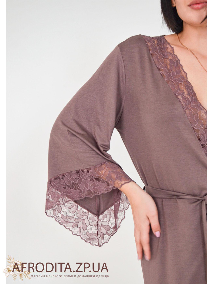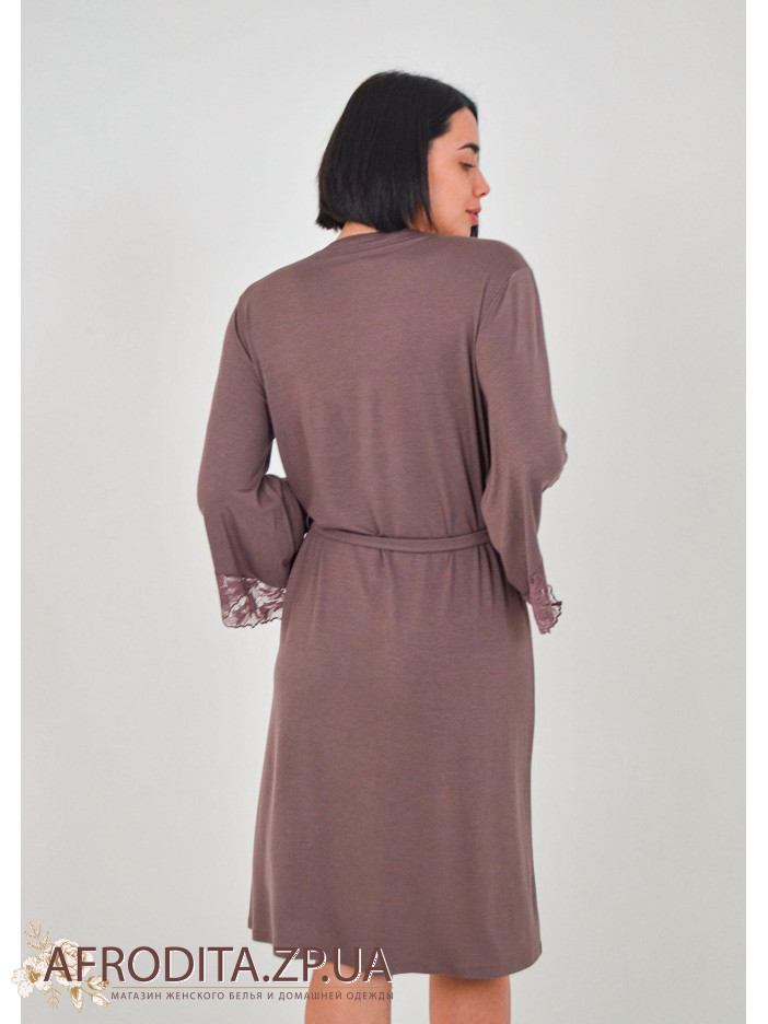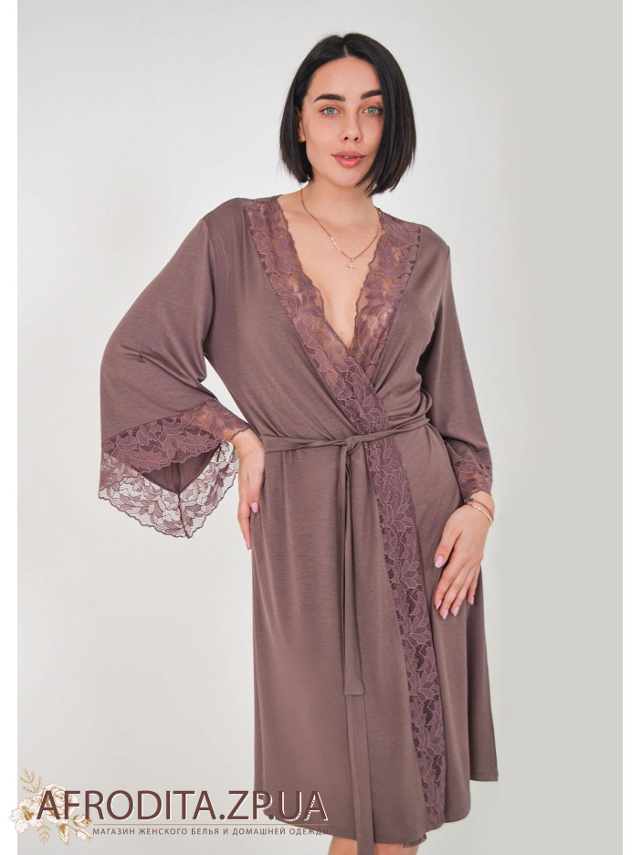 Жіночий халат на запах 1347-60868 виготовлений з ніжного та дуже приємного до тіла віскозного полотна. Халат середньої довжини, краї рукавів та борт халата прикрашені мереживом. Лінія талії регулюється поясом.