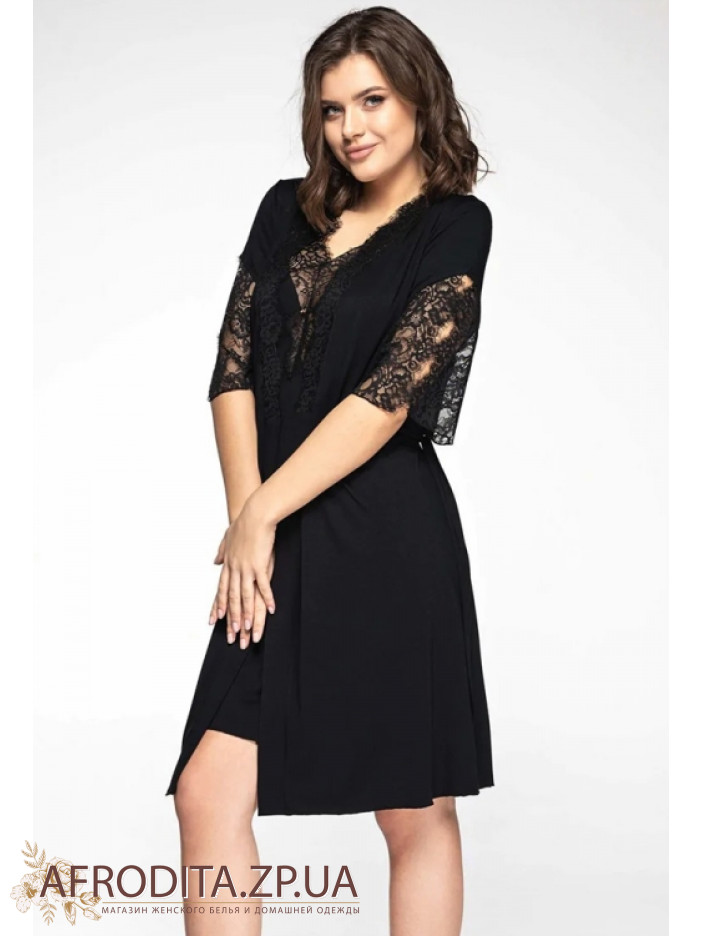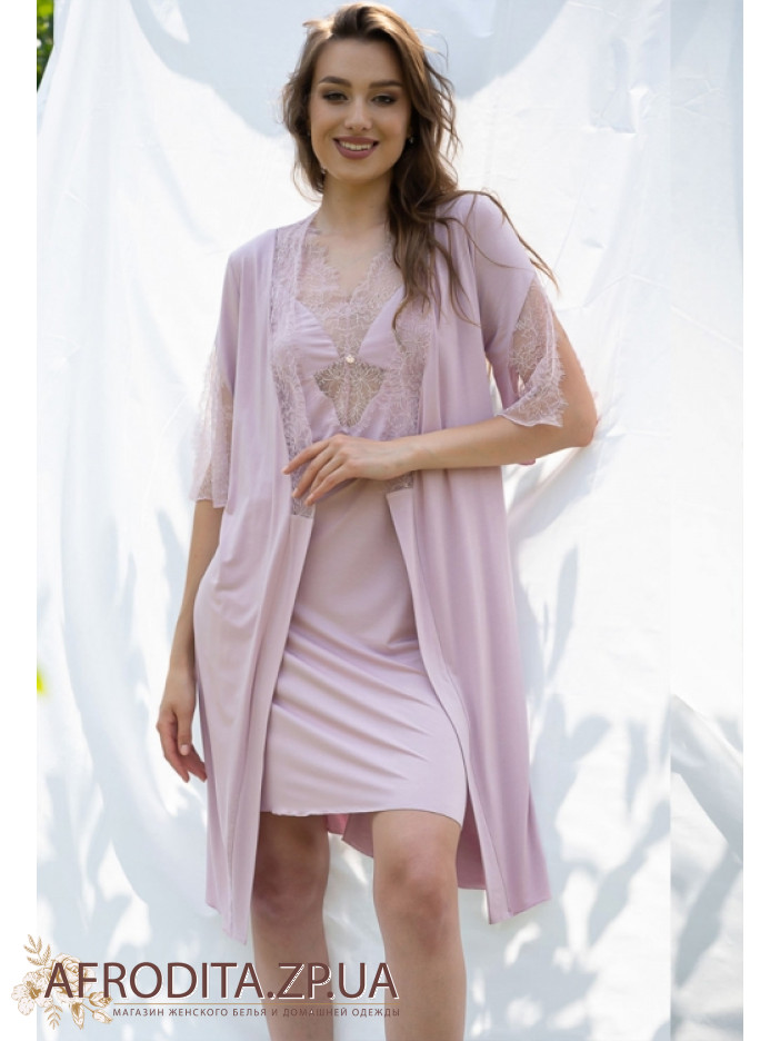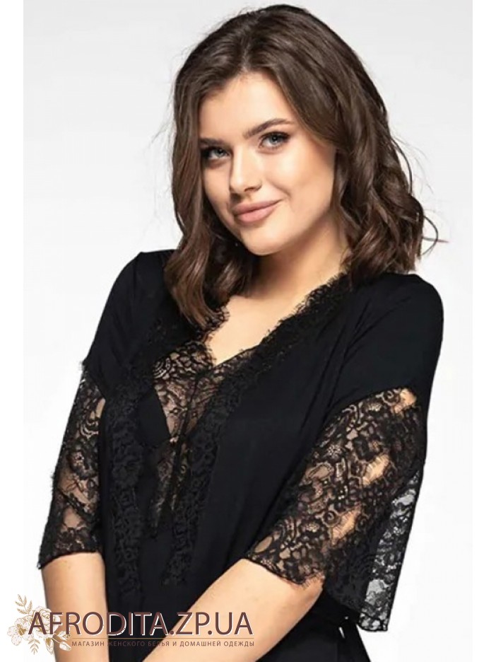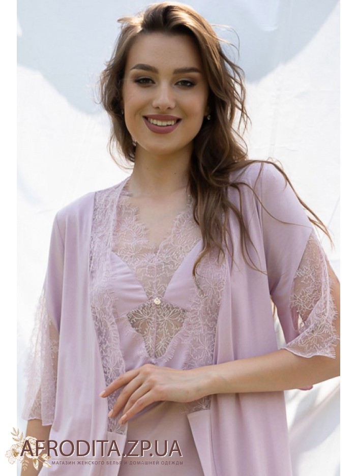 Жіночий халат на запах Shato 2013/1 із м'якої віскози. Халат довгий до колін з мереживними рукавами. Область декольте прикрашена мереживом тон виробу, лінія талії регулюється поясом.