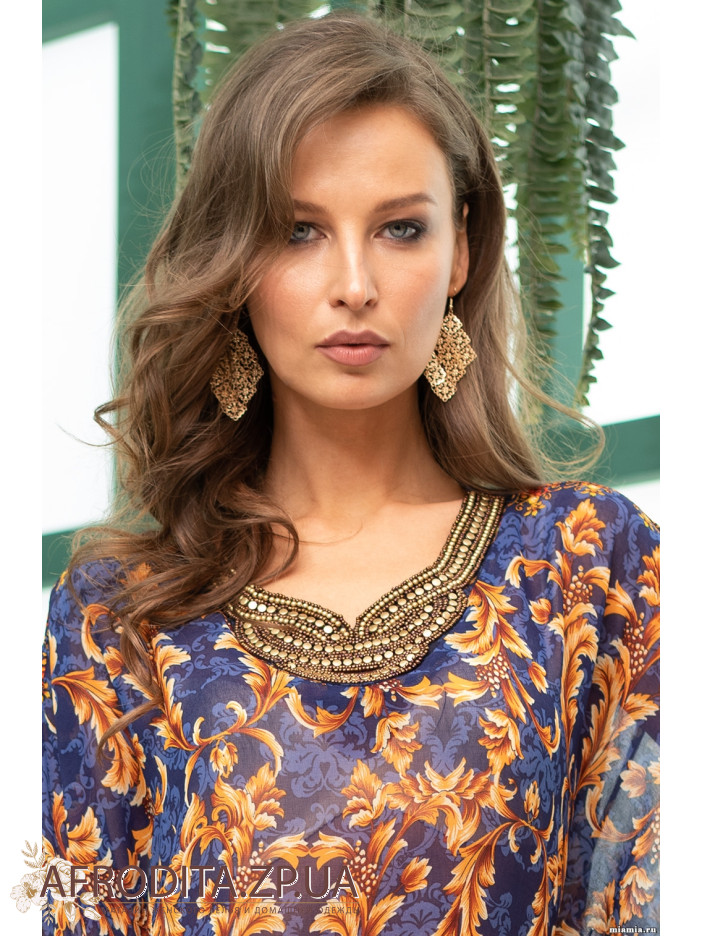 Пляжна довга туніка "Карлотта" 8541 від Mia-Amore вільного крою. Виріб виготовлено з повітряного шифону з оригінальною забарвленням. Лінія талії регулюється за допомогою пояса. Колекція весна-літо 2019. Склад: 100% поліестер.