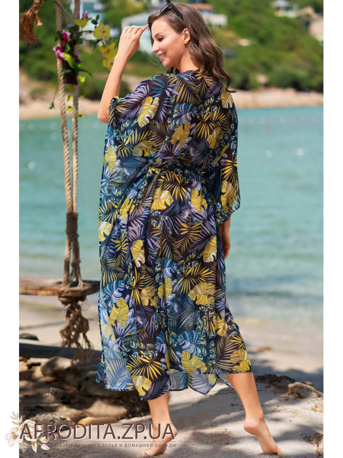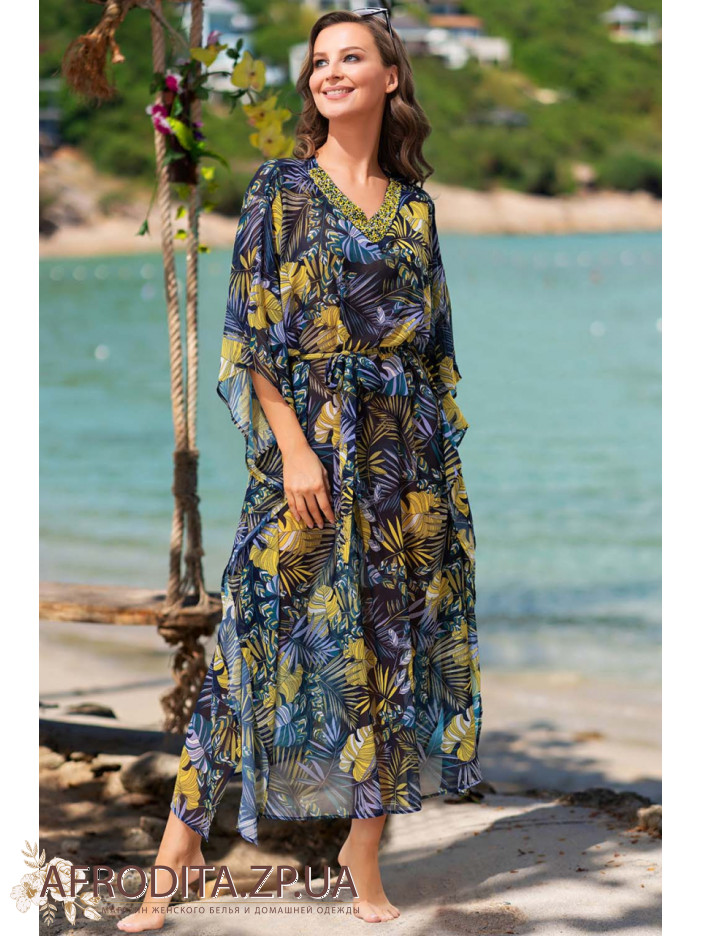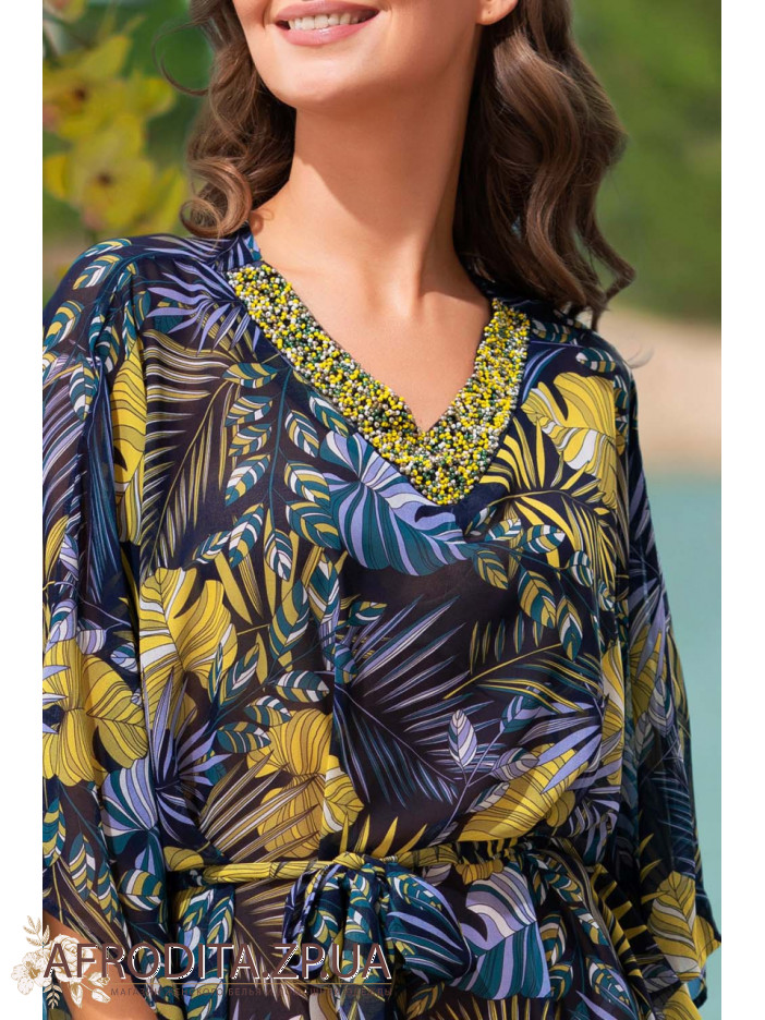 Пляжна ефектна туніка Коста Брава 8865 з повітряного струмуючого шифону, принтованого смарагдовим рослинним візерунком. Виріз горловини декорований ефектними прикрасою з бісеру в тон туніки. Ширина туніки по талії регулюється поясом. Склад: 100% поліестер.