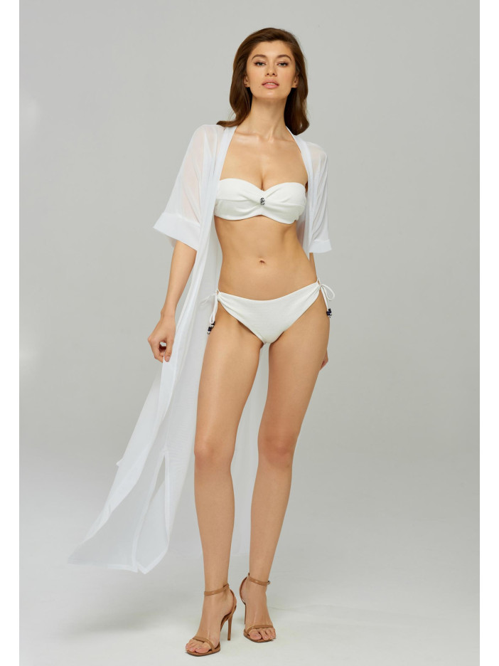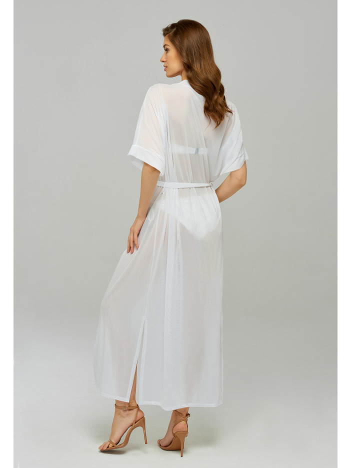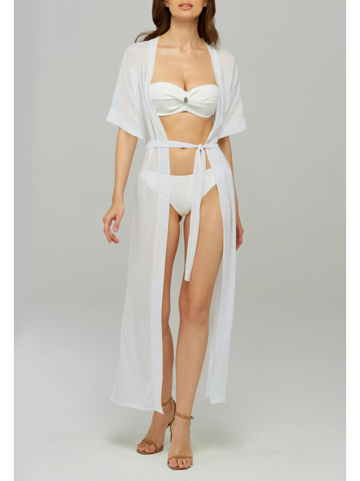 Літня туніка максі з коротким рукавом — легка та витончена модель для спекотних днів, виконана з напівпрозорої еластичної тканини, що м’яко струмує по фігурі та дарує комфорт, бічні розрізи додають свободи рухів і легкості образу, знімний пояс на зав’язках підкреслює талію та дозволяє змінювати силует, чистий білий колір додає образу свіжості, елегантності та курортного шику