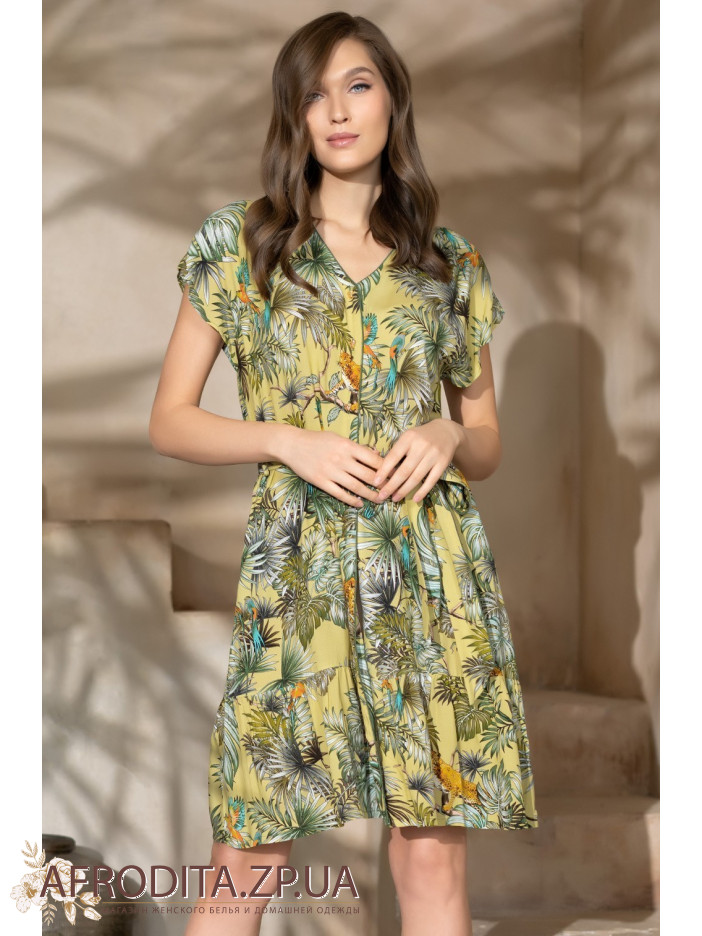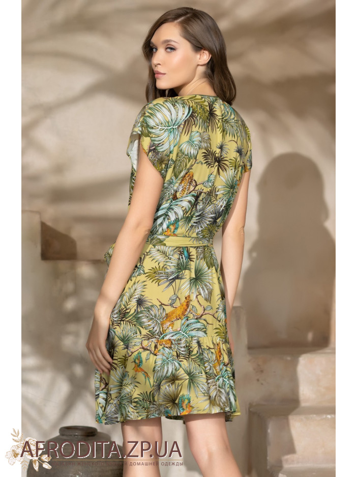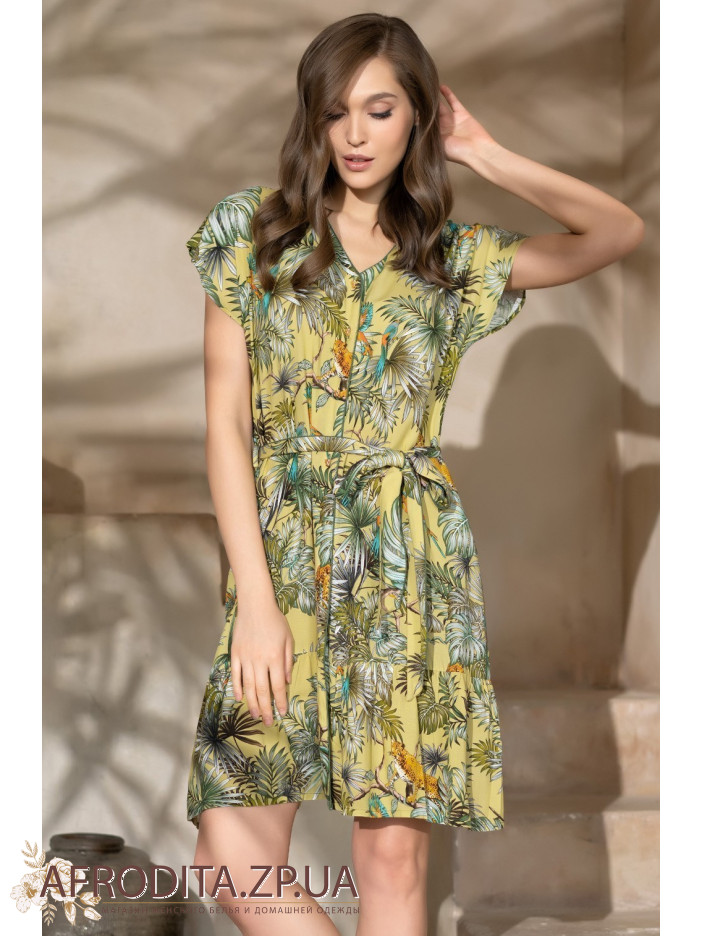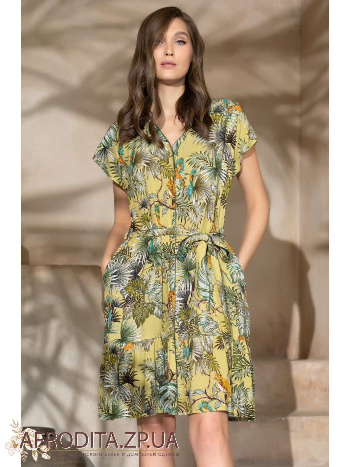 Сукня-сорочка Сафарі 1801 від Mia-Amore довжиною трохи вище колін з коротким рукавом і оборкою внизу. Виріб виконаний із тканої принтованої віскози. По центру застібка на ефектні золоті гудзики як леопардових голів. Лінію талії можна підкреслити за рахунок поясу, що йде у комплекті. По лінії борту та по краю пояса проходить контрастний кант. У бічних швах розташовані кишені.