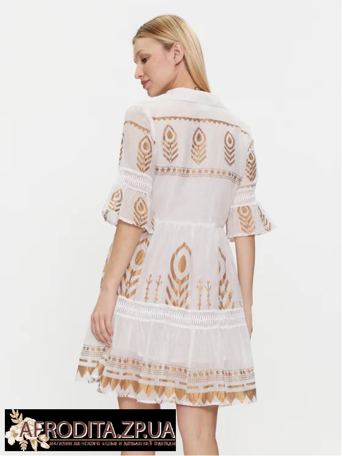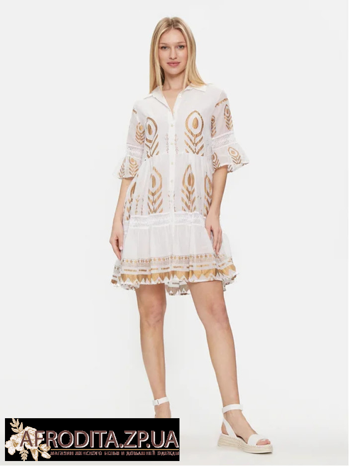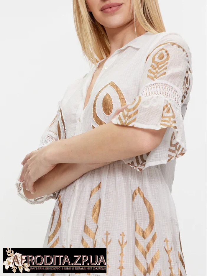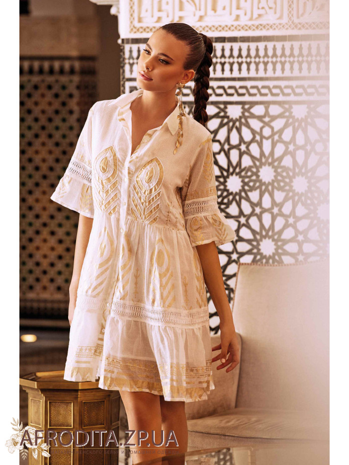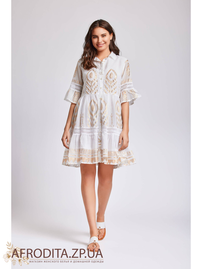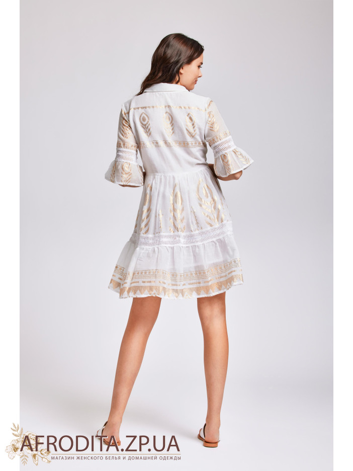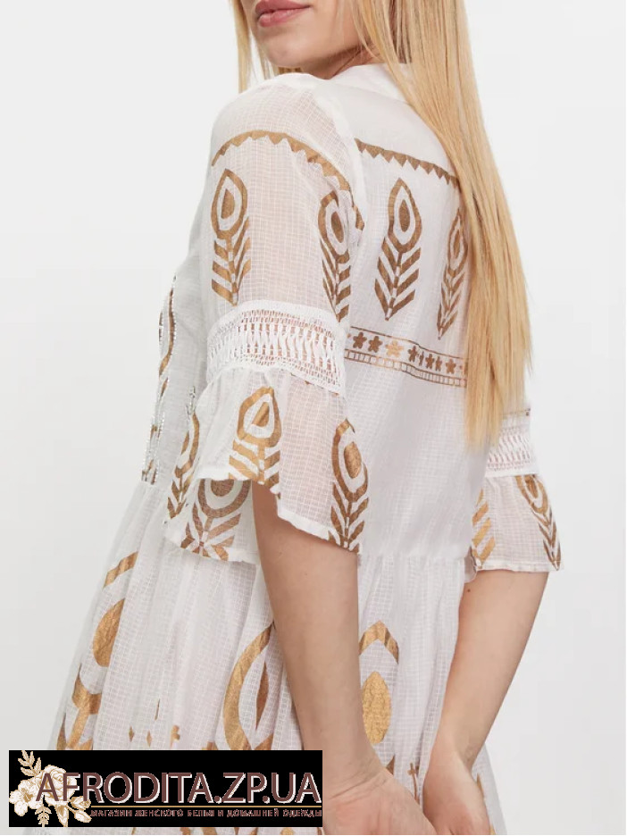 Сукня жіноча Iconique IC24-021 довжиною вище колін виготовлена з високоякісної бавовни зі світло-золотим принтом у стилі бохо. Комір сорочкового типу, сукня застібається на гудзики. Рукави розкльошені з довжиною 3/4.