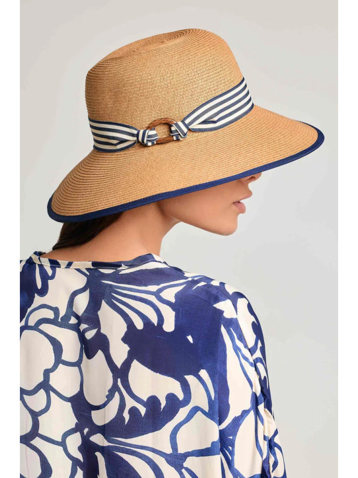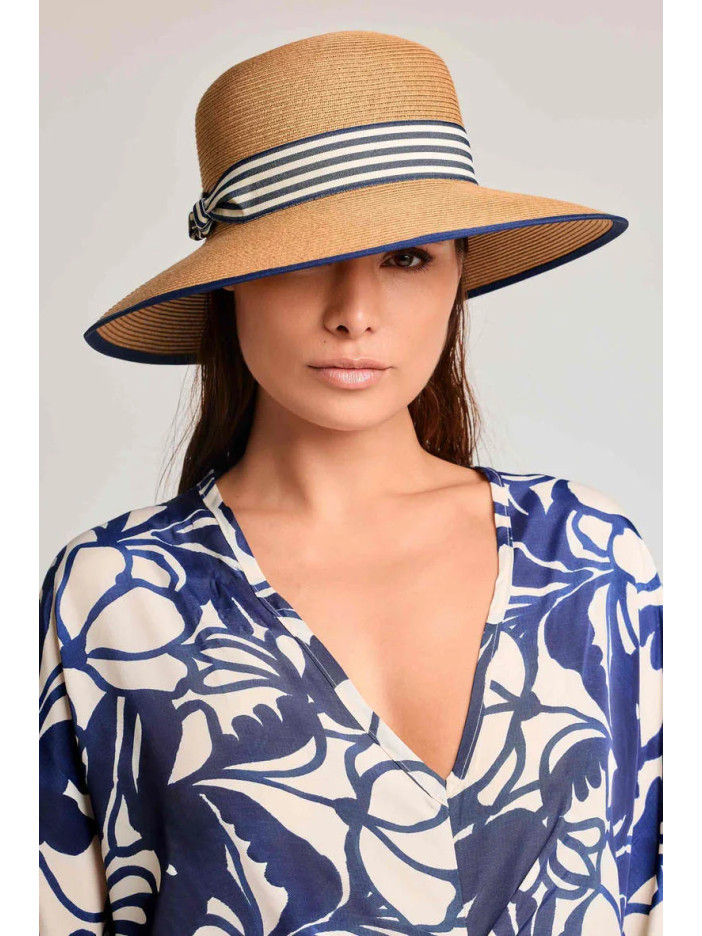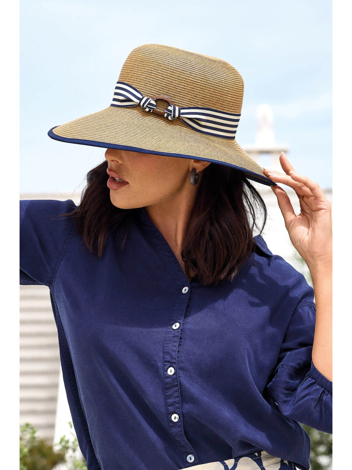 Солом’яний капелюх італійського бренду — елегантний акцент літнього образу, виконаний з легкого плетеного матеріалу, що забезпечує комфорт і чудову вентиляцію у спекотну погоду, широкі поля надійно захищають обличчя від сонця, контрастна окантовка та декоративна стрічка в морському стилі з витонченим вузлом додають моделі особливого шарму та роблять її стильним аксесуаром для пляжу й міста, ідеально доповнює як курортні, так і повсякденні образи