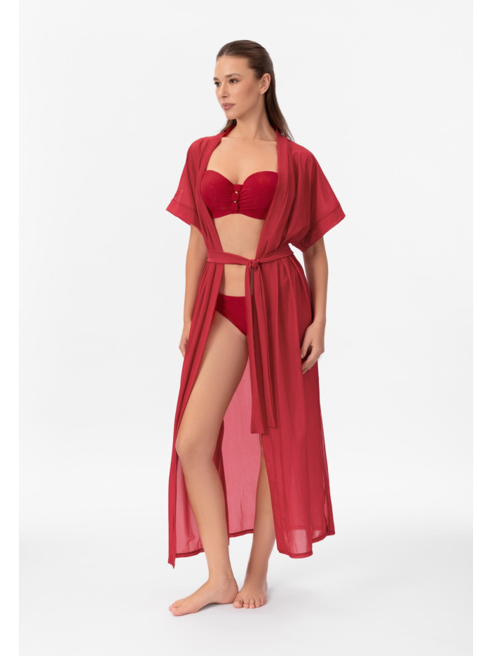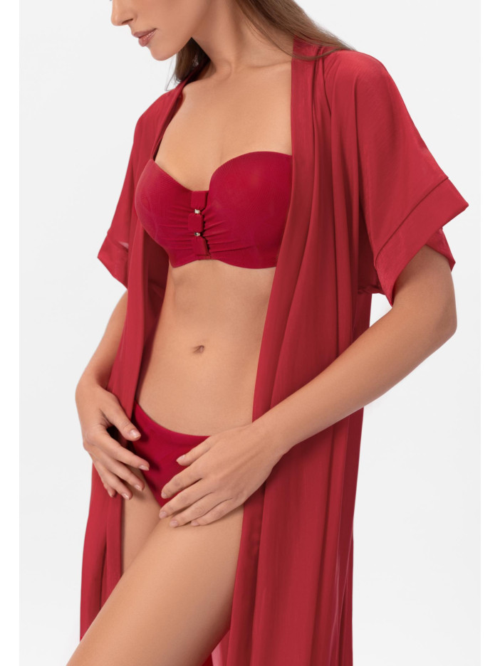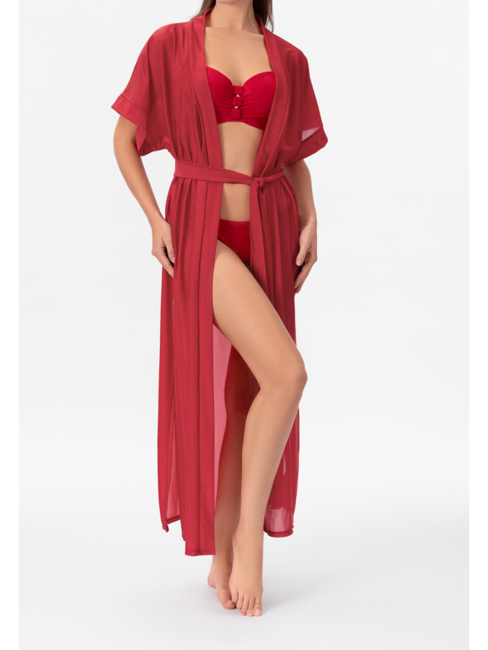 AURORA — енергія тяжіння, втілена у тканині та кольорі, яскравий червоний жакард миттєво привертає погляд, оживляючи силует і створюючи ефектний, незабутній образ, декоративні прямокутні елементи з основної тканини виступають як архітектурні акценти, доповнені витонченими золотими намистинами, повітряна туніка максі з сітки з делікатним вплетенням тонкої металізованої нитки створює легке мерехтіння та додає образу глибини і розкоші, бічні розрізи забезпечують свободу рухів і додають динаміки, пояс підкреслює талію та дозволяє сформувати елегантний силует, роблячи модель ідеальним вибором для яскравих літніх виходів