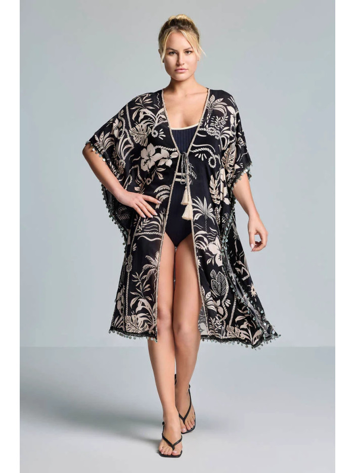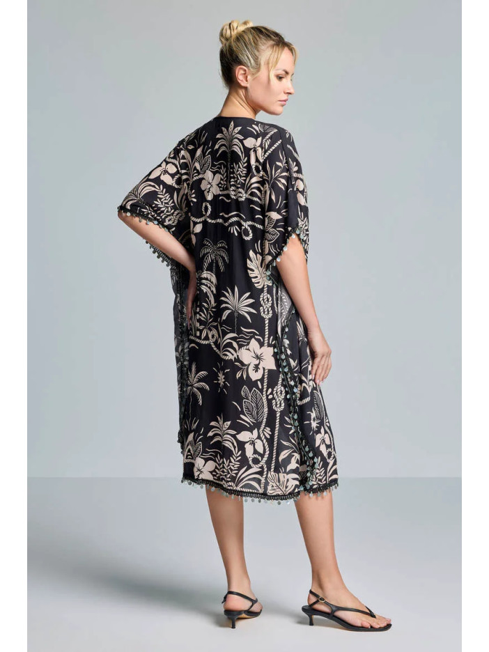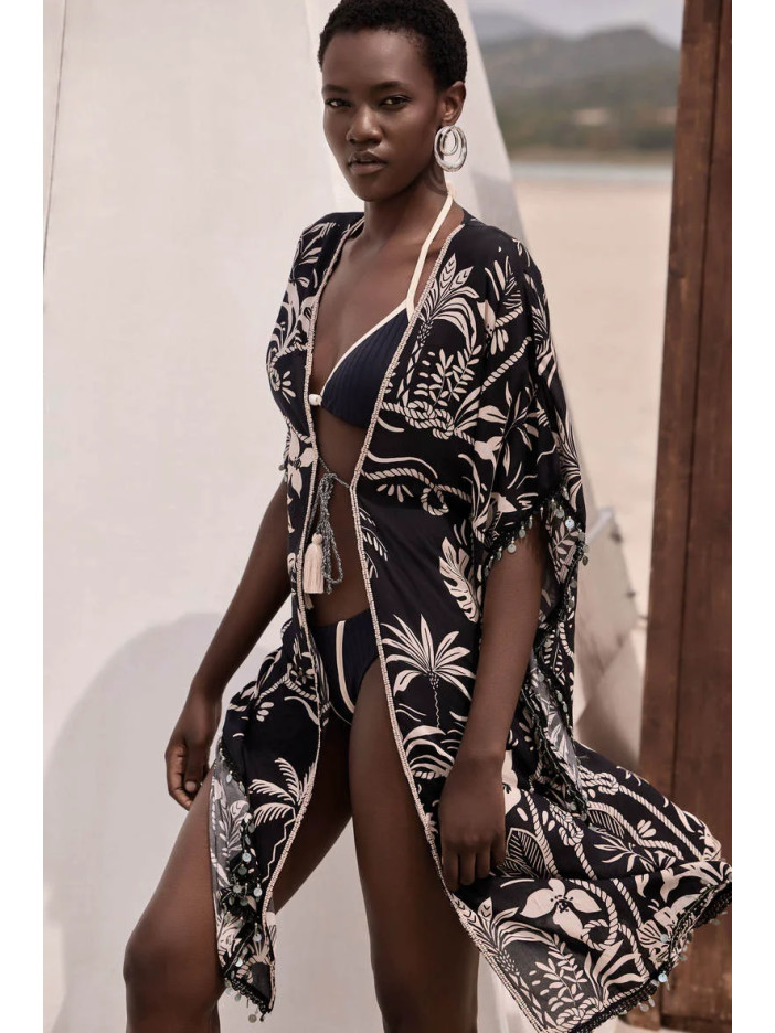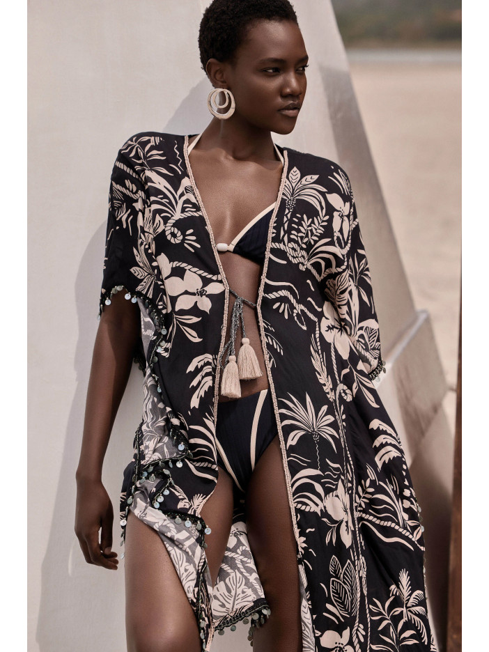 Вільний крій красиво струмує по фігурі, підкреслюючи силует і створюючи відчуття легкості. Контрастний рослинний принт у чорно-бежевій гамі додає образу вишуканості та легко поєднується з будь-якими купальниками.