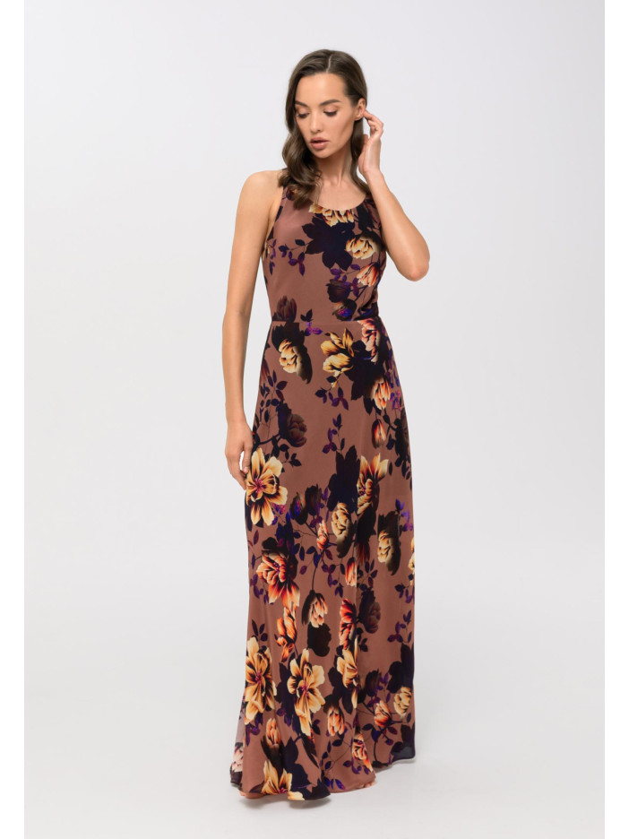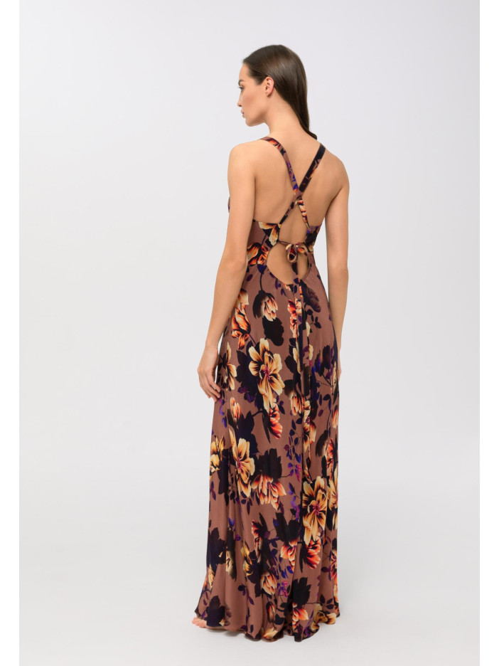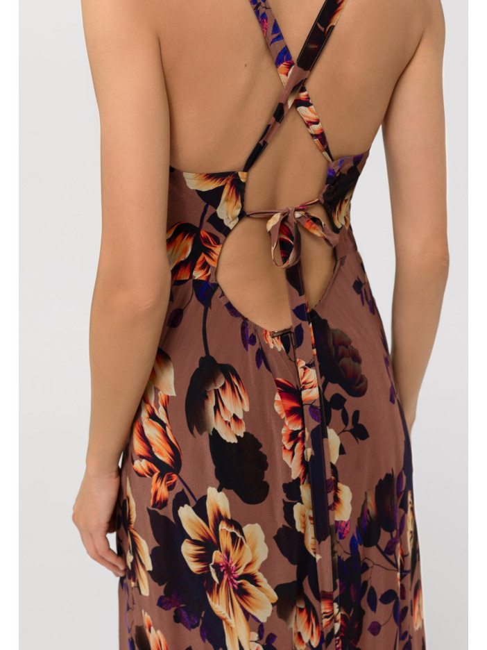 Серія FLOWER MANIA — це справжній витвір мистецтва, де багатошаровий ексклюзивний флористичний принт від італійських художників зачаровує з першого погляду: теплий теракотовий фон стає ідеальною основою для витонченої композиції з листя шипшини, тюльпанів і троянд, створюючи глибокий і виразний образ, лілова підкладка, тонкі бретелі в тон та аксесуари кольору рожевого золота додають м’якого контрасту й вишуканості, сарафан-максі приталеного силуету з віскози та шовку красиво підкреслює фігуру, відкрита спина додає легкості та чуттєвості, а регульовані бретелі, що переходять у зав’язки, забезпечують ідеальну посадку та комфорт