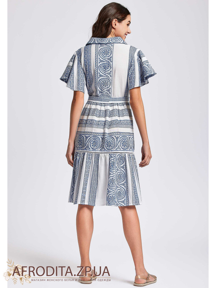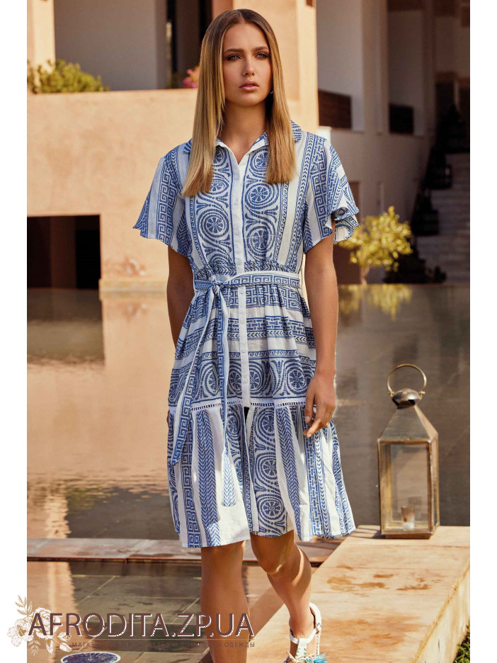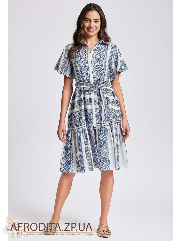 Жіноча літня сукня David DB24-036 з бавовни, яка втілює елегантність і свіжість. Сукня з коротким рукавом і застібається на гудзики. Традиційний комір сорочкового типу, у комплекті є пояс.