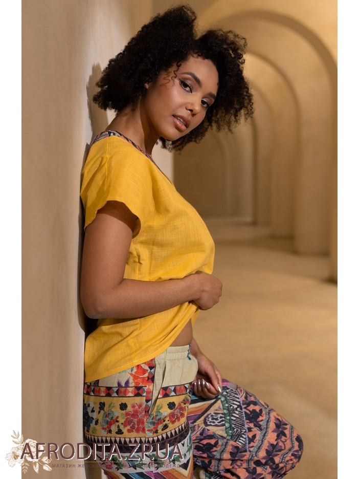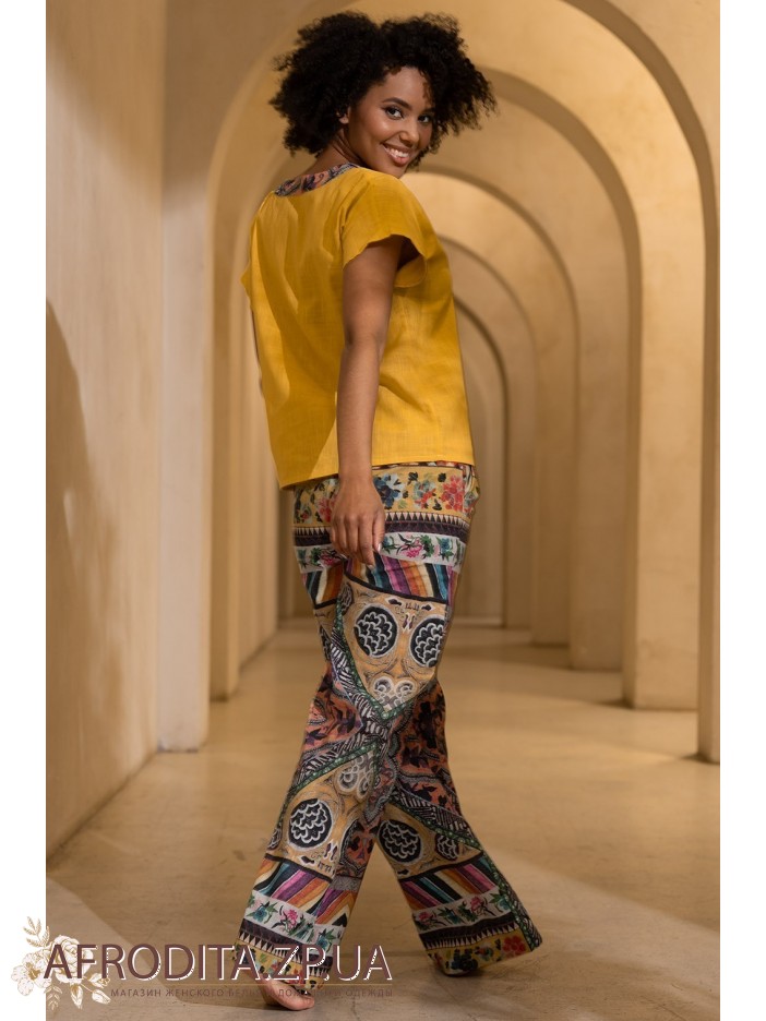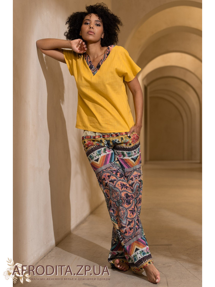 Комплект Камбоджа 5276 від Mia-Amore складається з топу вільного силуету з коротким рукавом та широких штанів. V-подібний виріз горловини топа підкреслено декоративним обточуванням. Штани з широким еластичним поясом та лаштунками. З боків штанів розташовані кишені. Штани виконані із принтованої тканини, а топ із однотонного компаньйона.
