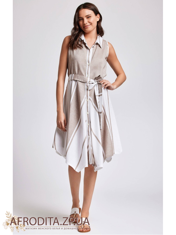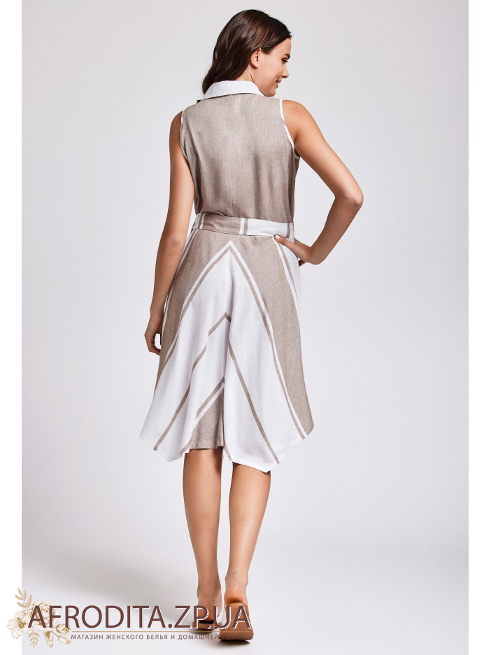 Жіноча літня сукня із льону Iconique IC24-025 середньої довжини. Сукня застібається на гудзики, комір сорочкового типу, лінія талії регулюється поясом.