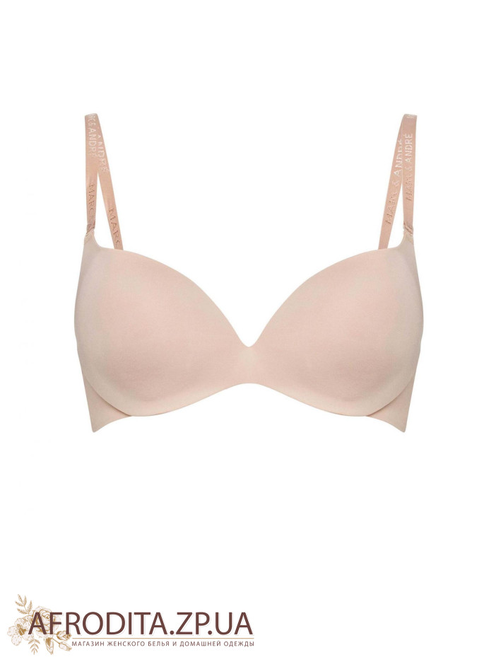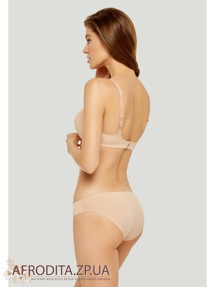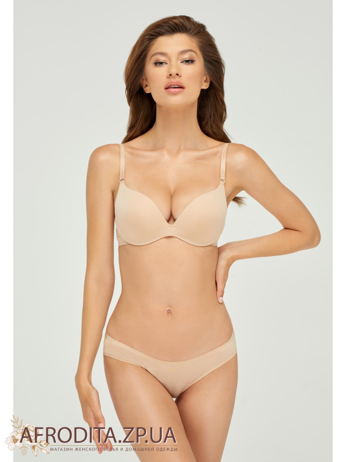 Безшовний бюстгальтер тілесного кольору з формованою чашкою і вбудованим пуш-ап, без кісточки. У конструкції стану використовується новий ультрагібкій пластик з 3-D технологією, що забезпечує підтримуючий ефект. Знімні бретелі. Спинка безшовна, з подвійною тканини, ідеально прилягає до тіла і не помітна під облягає одягом.