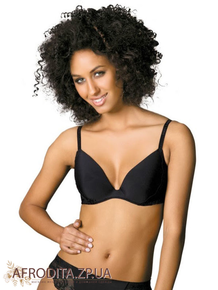 Бюстгальтер з однотонного полотна в поєднанні з еластичним мереживом. Класична мигдалевидна формована чашка на каркасах з вбудованим "push up" коректором і мереживною обробкою. Деталь, що з'єднує чашки звужена, що дозволяє максимально відкрити лінію декольте. Склад: Поліамід 80%, Еластан 20%. Колір чорний.