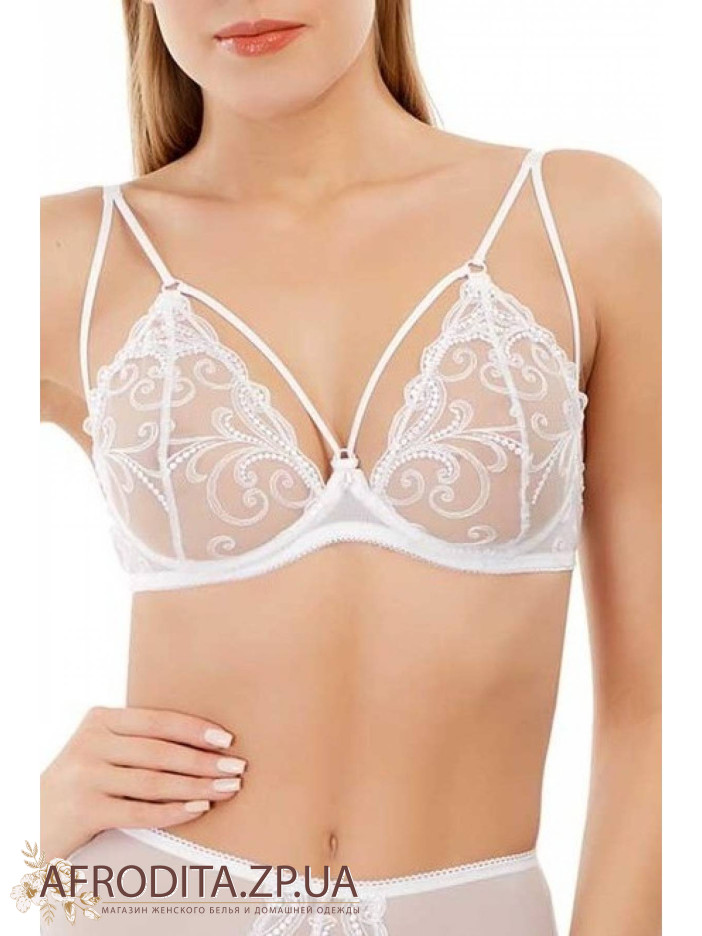Бюстгалтер з м'якою чашкою, на каркасній підтримки. Декорований витонченої вишивкою і еластичними стрічками по лінії декольте і бретелей. Між чашечками - перлова підвіска. Глибока лінія декольте.