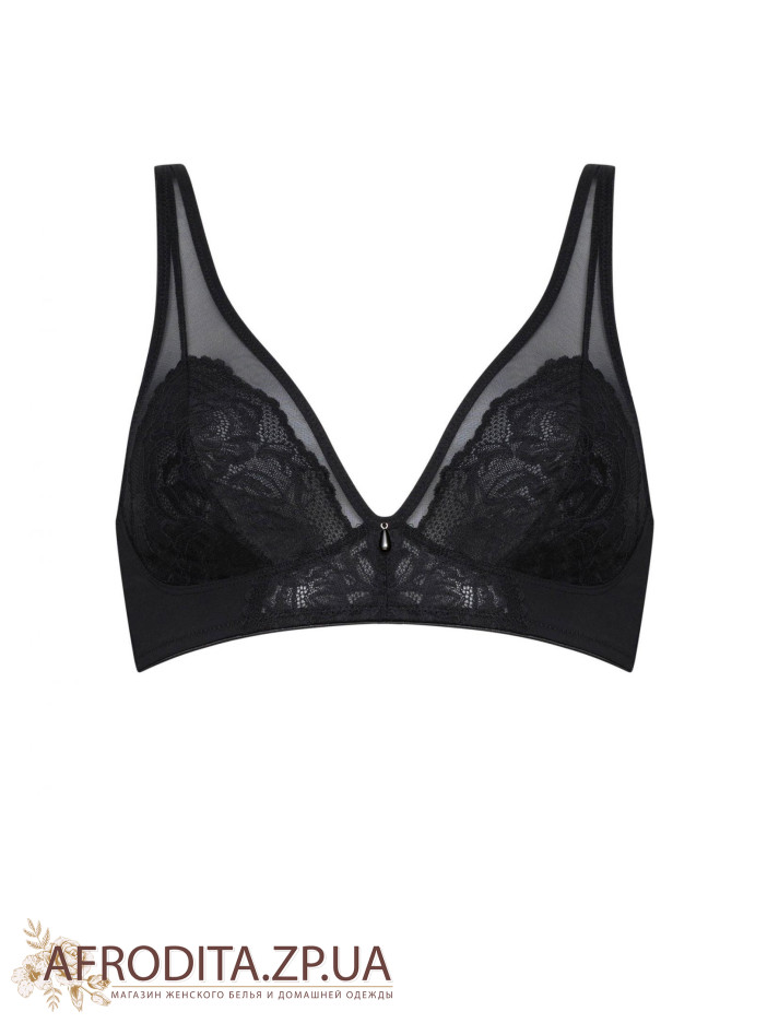 Мягкий бюстгальтер черного цвета без косточек. Удлиненный, комфортное состояние с симметричными фигурными вставками из эластичного кружева. Боковые детали с поддерживающими косточками. Декор - жемчужинка.