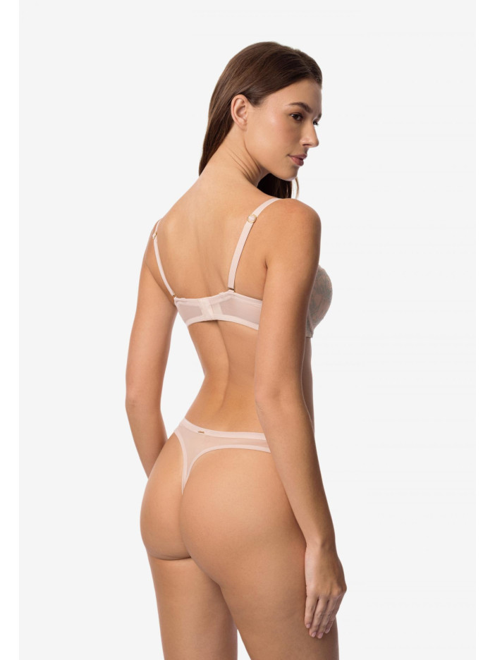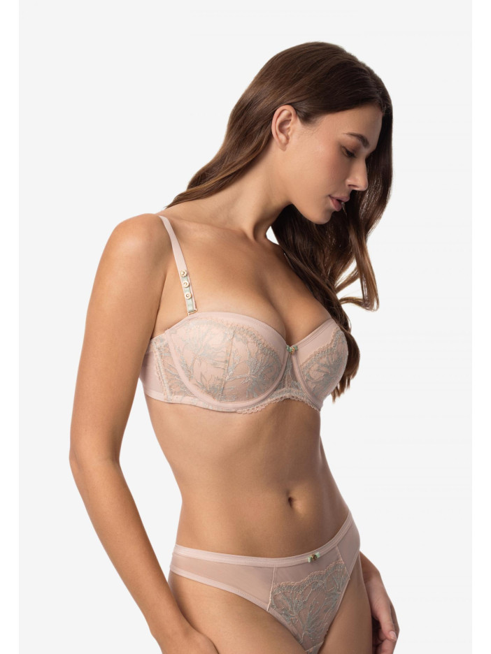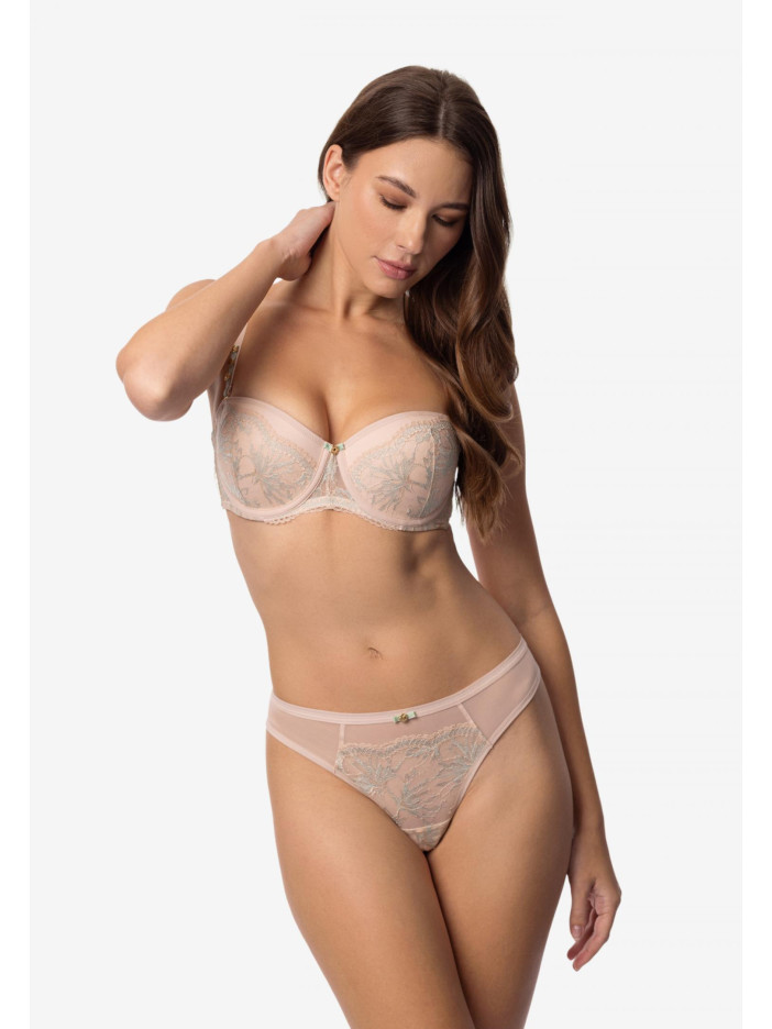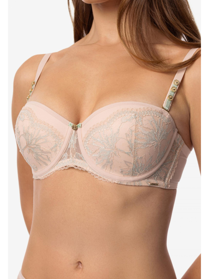 Серія ANTOINETTE — це елегантне мереживо в м'яких тонах, легке і прозоре на приємній основі. Ніжно-рожевий колір з м'ятними акцентами додає свіжості образу. ANTOINETTE поєднує легкість і виразність, об'єднуючи делікатність і впевненість. Бюстгальтер-балконет, створений для ідеальної форми і впевненості кожен день. М'яка формована чашка з вбудованим коректором пуш-ап підкреслює природні лінії, створюючи спокусливий силует. Витончене мереживне оформлення надає моделі витонченості, а еластична сітка і каркасна підтримка забезпечують комфорт і надійну посадку. По верхньому краю — силіконова стрічка, яка фіксує білизну навіть без бретелей. У комплекті додаткові прозорі силіконові бретелі для універсальності образу.