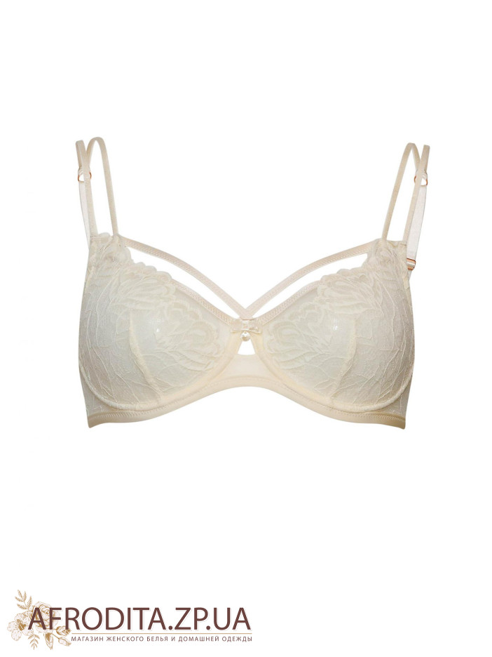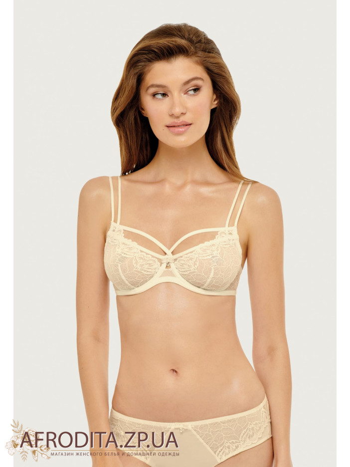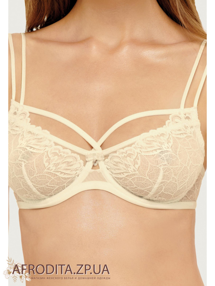 Бюстгальтер на каркасній підтримці з м'якою чашкою. Внутрішня поверхня чашки дубльована еластичною сіткою, що забезпечує ідеальну посадку. М'який стан зроблений з мережива. Декор – бантик з кристалом.