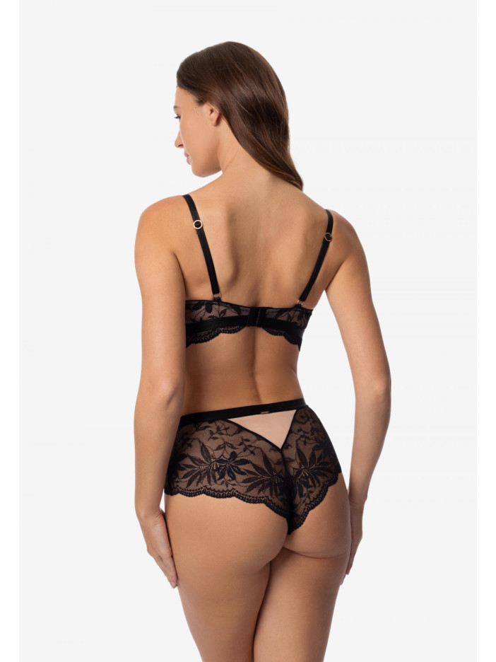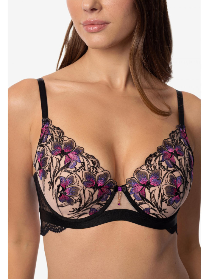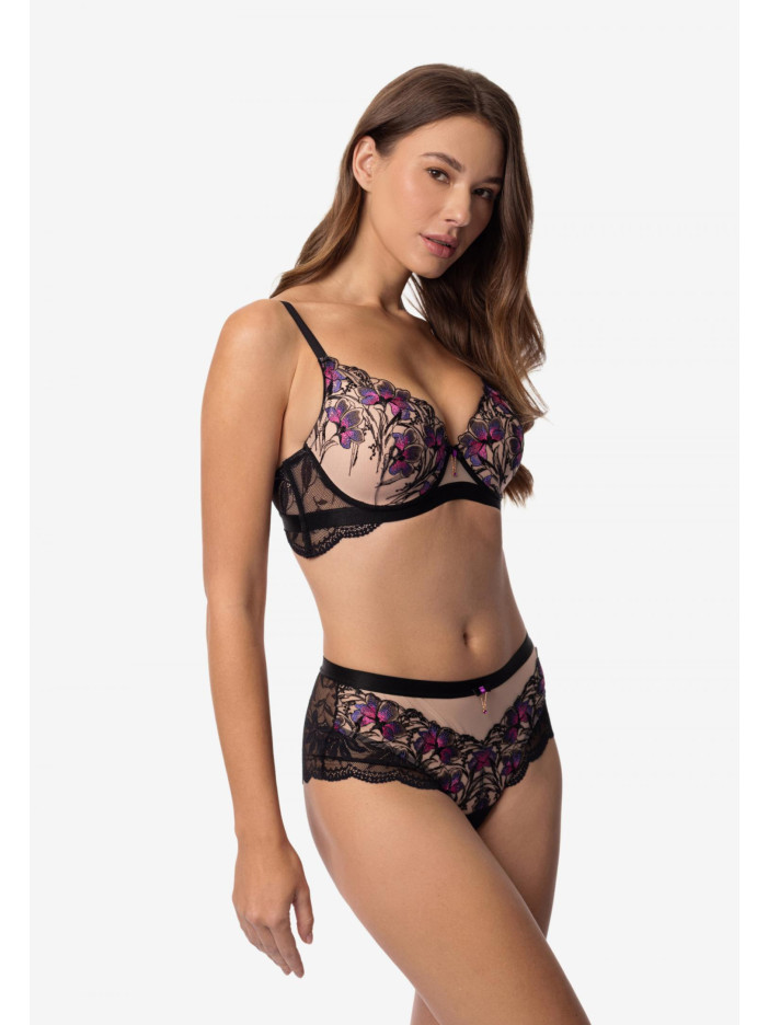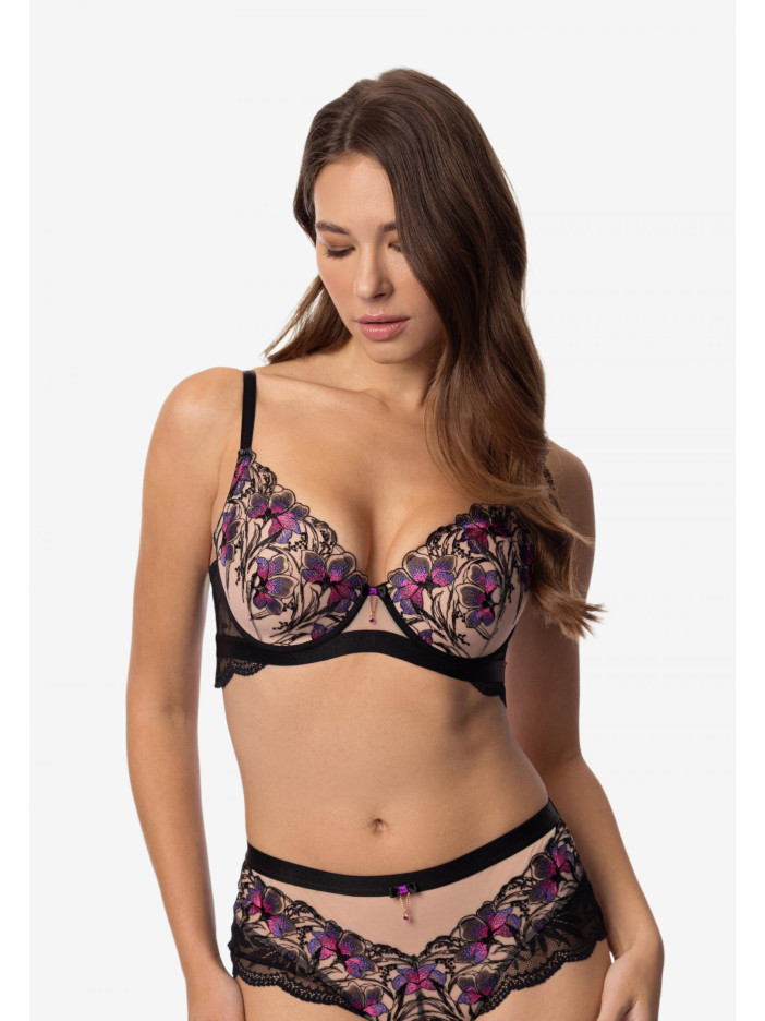 GLORIOUS — виразна спідня білизна з витонченою квітковою вишивкою та чорним еластичним мереживом. Насичені відтінки на темному тлі створюють вражаючий контраст, немов сад, що розквітає в опівнічній темряві. Ця білизна — втілення жіночності та впевненості, відображене в кожному вигині та лінії. Формований бюстгальтер з каркасною підтримкою і вбудованими пуш-ап коректорами надає грудям красиву форму і забезпечує ідеальну посадку. Чашки прикрашені делікатною вишивкою, створюючи витончений і вишуканий образ. Стан виконаний з м'якого мережива з сітчастою підкладкою, а бічні кісточки акуратно фіксують силует, формуючи гармонійну і комфортну посадку.