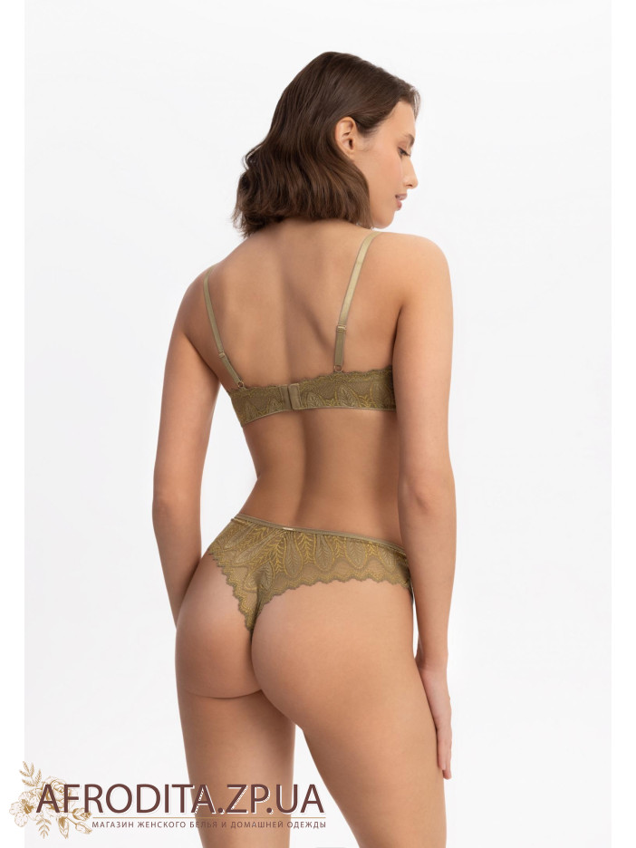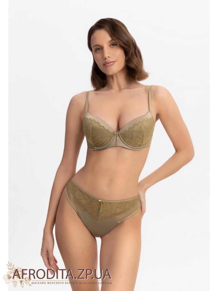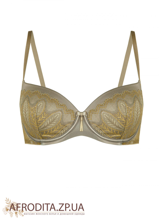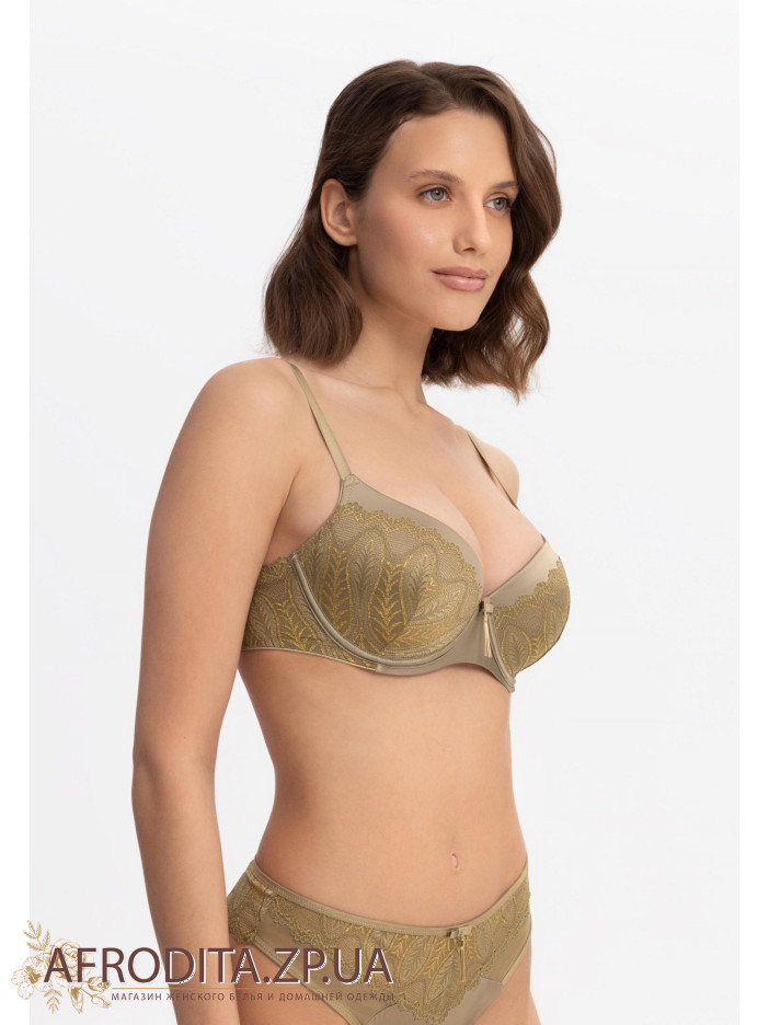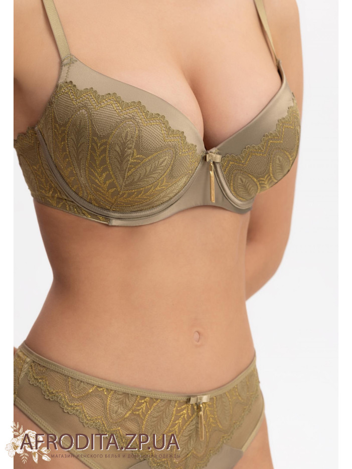 Бюстгальтер з формованими чашками з вбудованими коректорами пуш-ап на кісточках. Чашки декоровані атласною мікрофіброю і мереживом. Комбінований стан з мережива і атласної мікрофібри на підкладці з м'якої сітки.