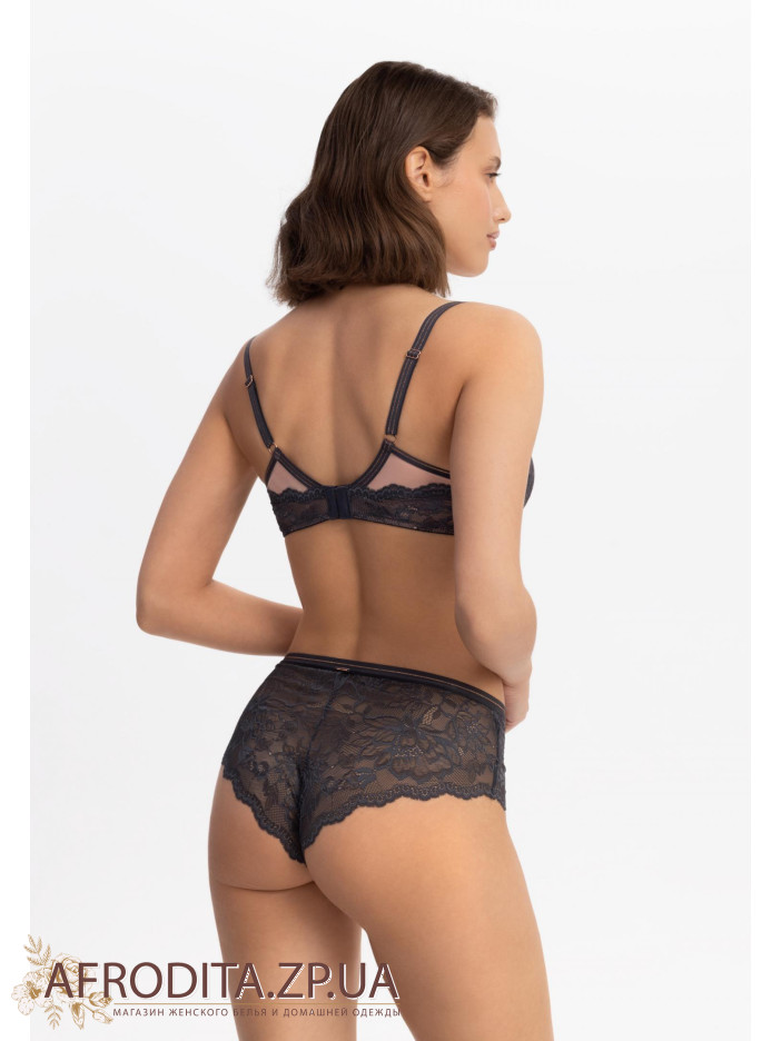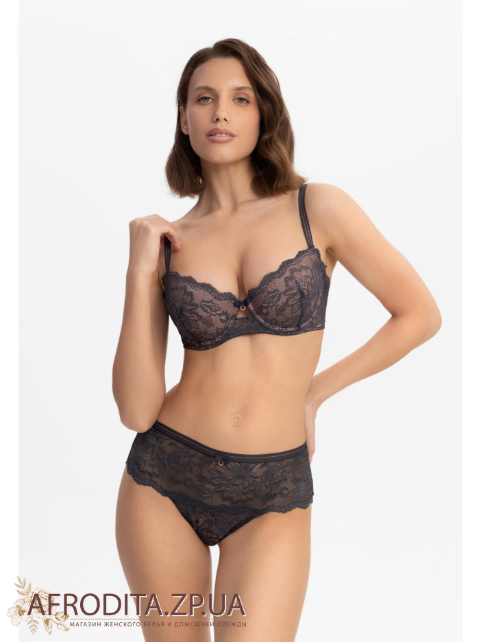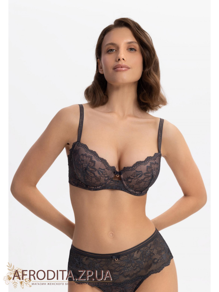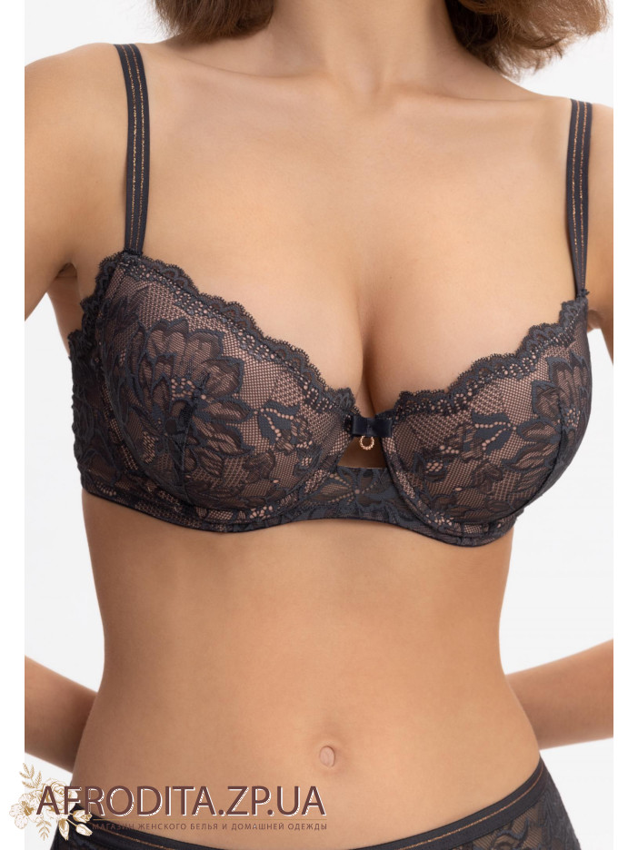 Бюстгальтер зі знімними подушечками пуш-ап на кісточках. Внутрішня частина чашки дубльована бавовною. Перехрест деталей із мікрофібри та мережива на бічній панелі приховує проблемні зони в області. Кругла комфортна спинка. Широкий розмірний ряд.