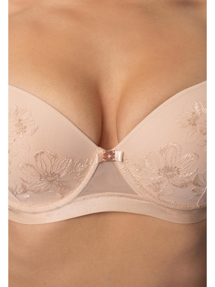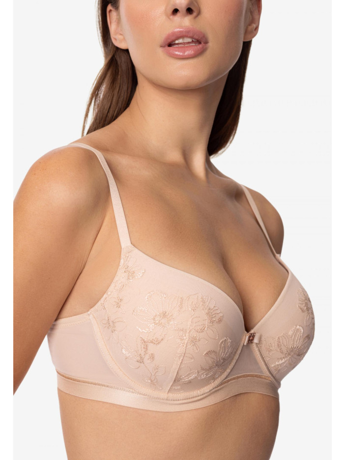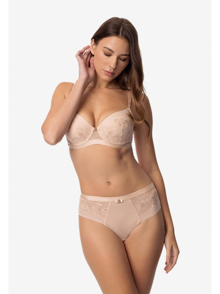 Серія SERENE — втілення внутрішньої гармонії та легкості. Вироби колекції прикрашені вишуканою вишивкою в нюдовому відтінку з тонким мерехтінням золотистої нитки. Ці витончені деталі створюють відчуття легкості та природної елегантності. Серія створена для тих, хто цінує легкість, витонченість і м'яке сяйво в образах. Бюстгальтер з формованими чашками і вбудованими пуш-ап коректорами підкреслює природну лінію грудей, створюючи гармонійний і спокусливий силует. Каркасна підтримка і еластична резинка під грудьми забезпечують надійну фіксацію і комфорт протягом усього дня. Стан виконаний з легкої еластичної сітки, елегантна кругла спинка прикрашена симетричними мереживними вставками, надають моделі особливого шарму і вишуканості. SERENE — це легкість, впевненість і витончена жіночність в кожній лінії.