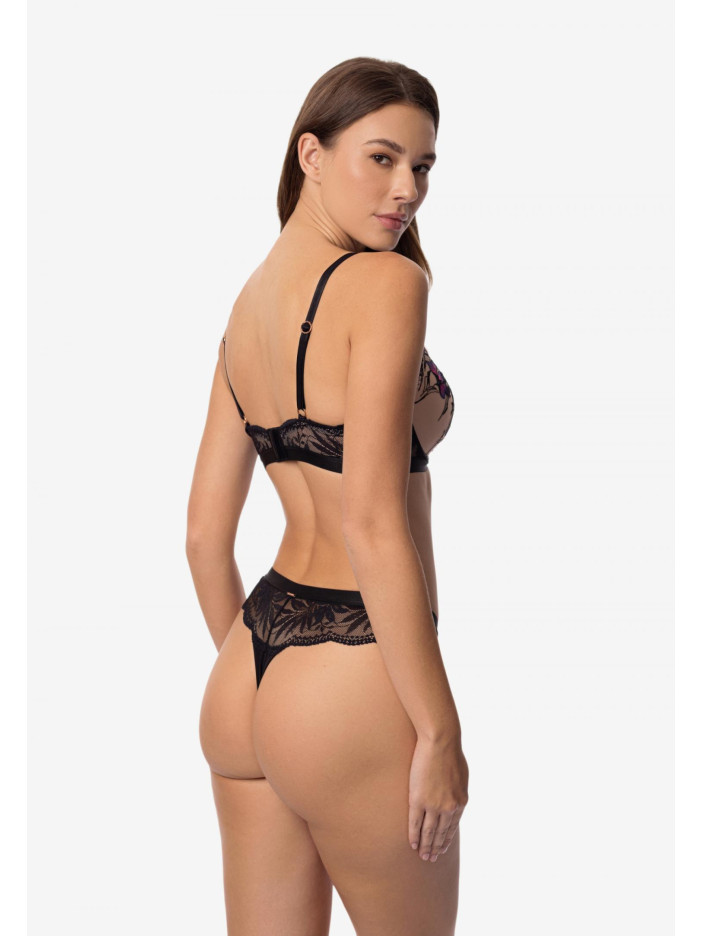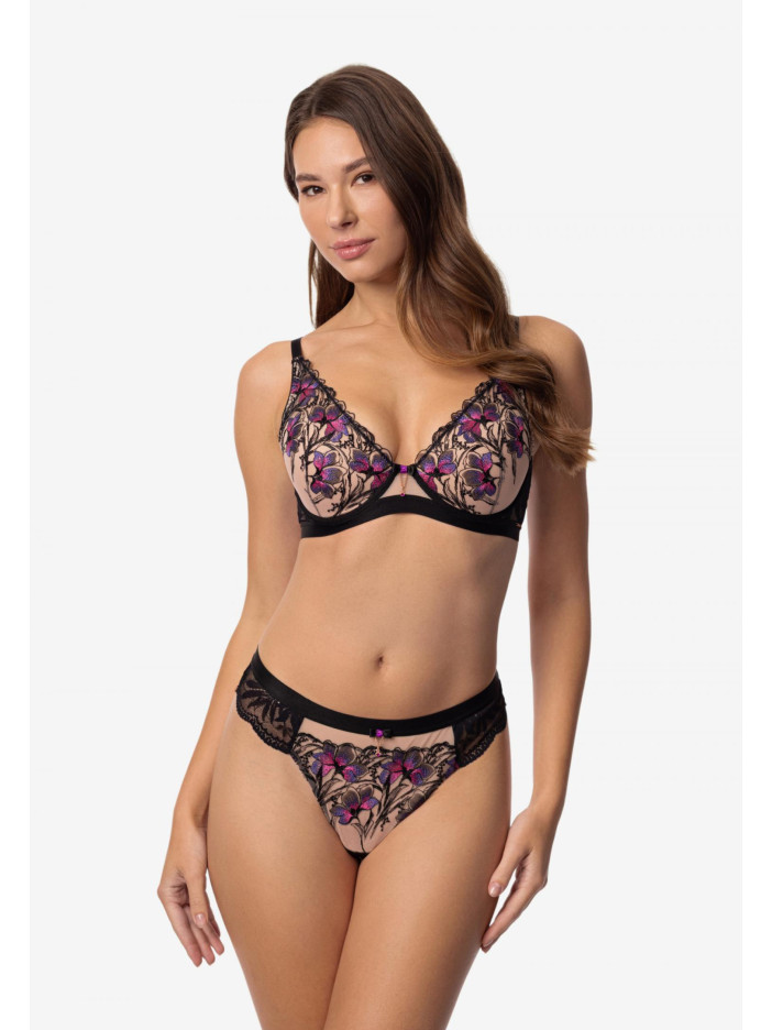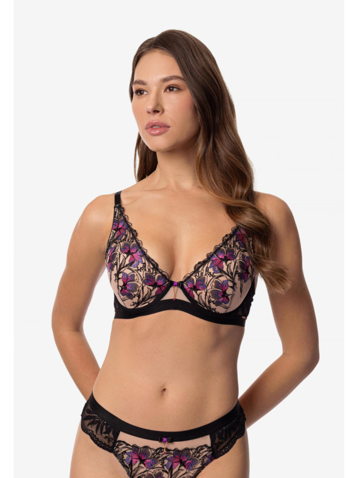 GLORIOUS — виразна спідня білизна з витонченою квітковою вишивкою та чорним еластичним мереживом. Насичені відтінки на темному тлі створюють вражаючий контраст, немов сад, що розквітає в опівнічній темряві. Цей одяг — втілення жіночності та впевненості, відображене в кожному вигині та лінії. Елегантний бюстгальтер з формованими чашками на каркасній підтримці поєднує стиль і зручність. Вишивка на сітчастій тканині додає витончений декоративний акцент, а м'який мереживний стан з еластичною підкладкою забезпечує комфортну посадку. V-подібна лінія декольте підкреслює граціозність силуету і витонченість образу.