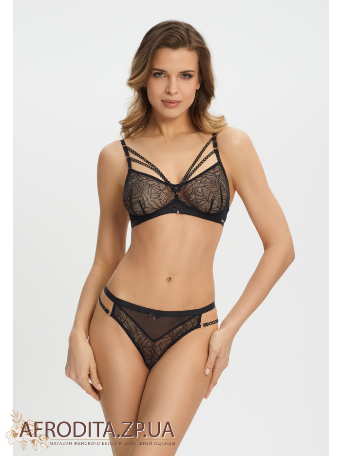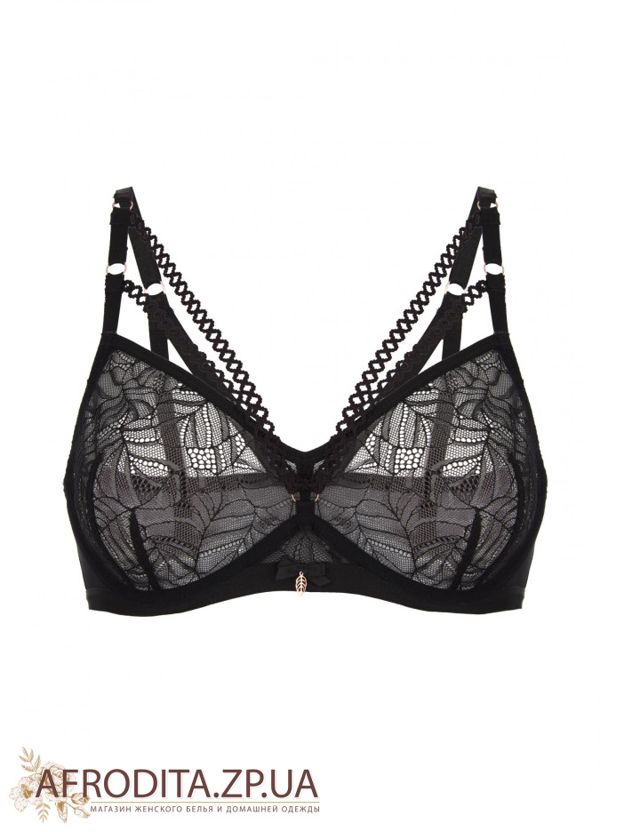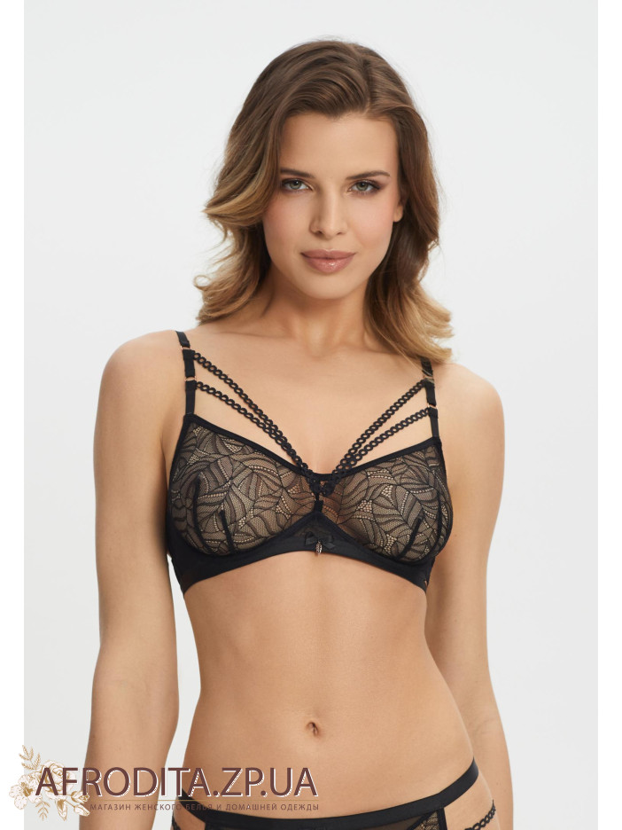 Бюстгальтер з м'якою прозорою чашкою на кісточках максимально спокусливий. Повністю мереживна чашка дає змогу відчути себе фатальною дамою. Декоративні елементи з подвійної еластичної тасьми-ланцюжка по лінії декольте завершують образ. Пояс виконаний із сітки. Бічні підтримуючі кісточки забезпечують комфорт.