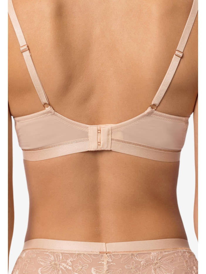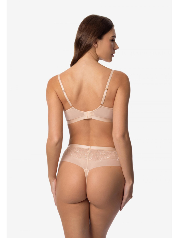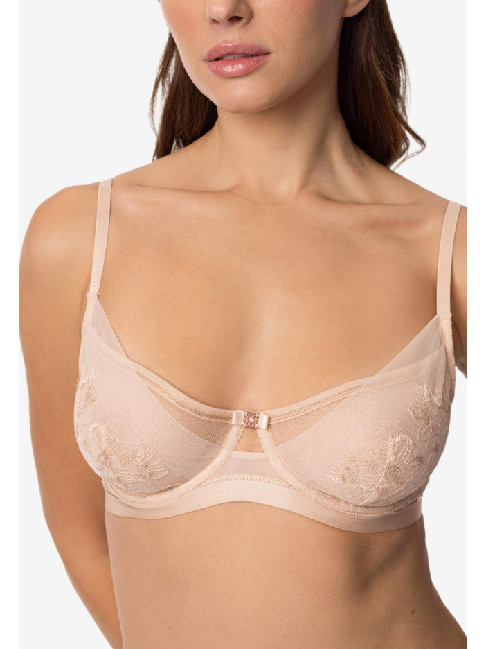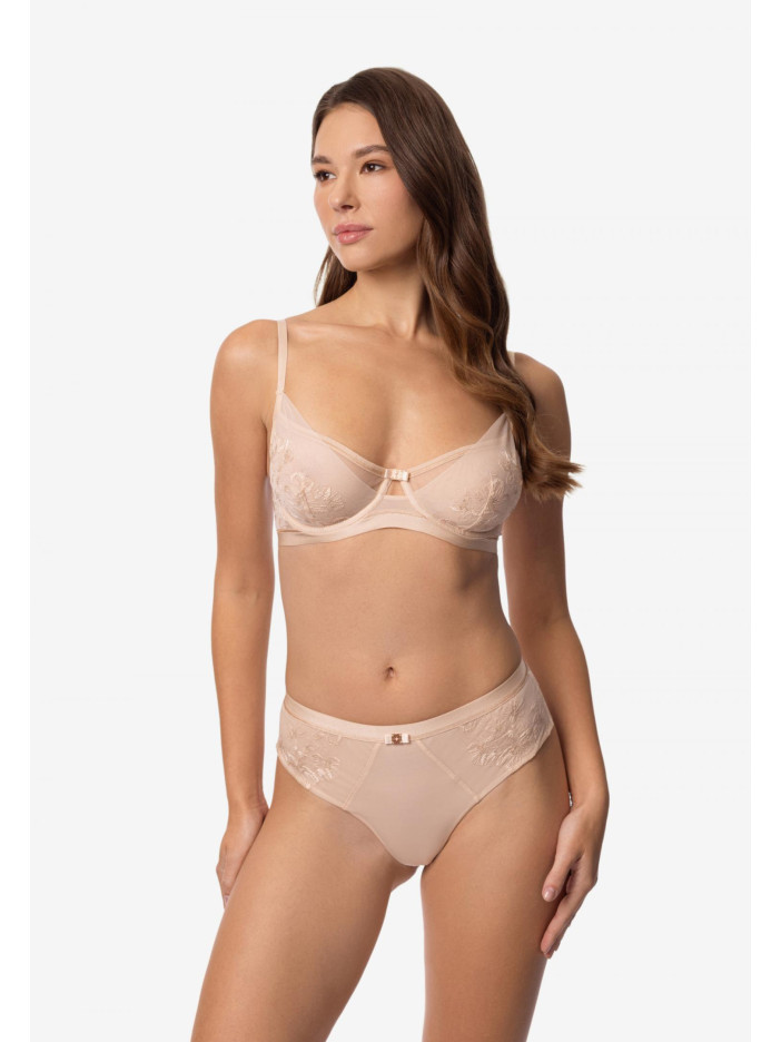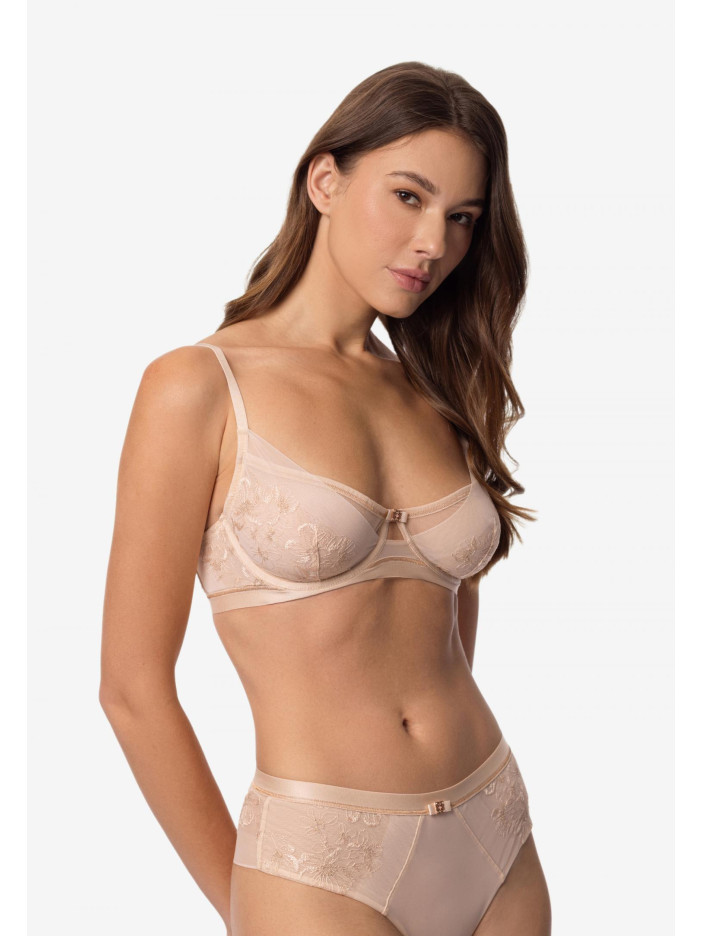 Серія SERENE — втілення внутрішньої гармонії та легкості. Кожен виріб серії прикрашений вишуканою вишивкою в нюдовому відтінку з делікатним мерехтінням золотистої нитки, що створює м'яке світіння на шкірі. Колекція створена для тих, хто цінує легкість, витонченість і природну елегантність у кожному образі. Бюстгальтер з м'якими чашками на кісточках поєднує прозору легкість і вишуканий декор. Еластична сітка в основі чашок забезпечує м'яке і комфортне прилягання, а зовнішня сторона, прикрашена тонкою вишивкою по сітці, додає моделі витончений акцент. Стан виконаний з сітки з вишивкою на підкладці, що надає бюстгальтеру невагомість і одночасно зберігає ідеальну підтримку. Еластична резинка під грудьми підсилює фіксацію, підкреслюючи природні лінії силуету. Прозорі деталі і сяюча вишивка роблять образ жіночним, легким.