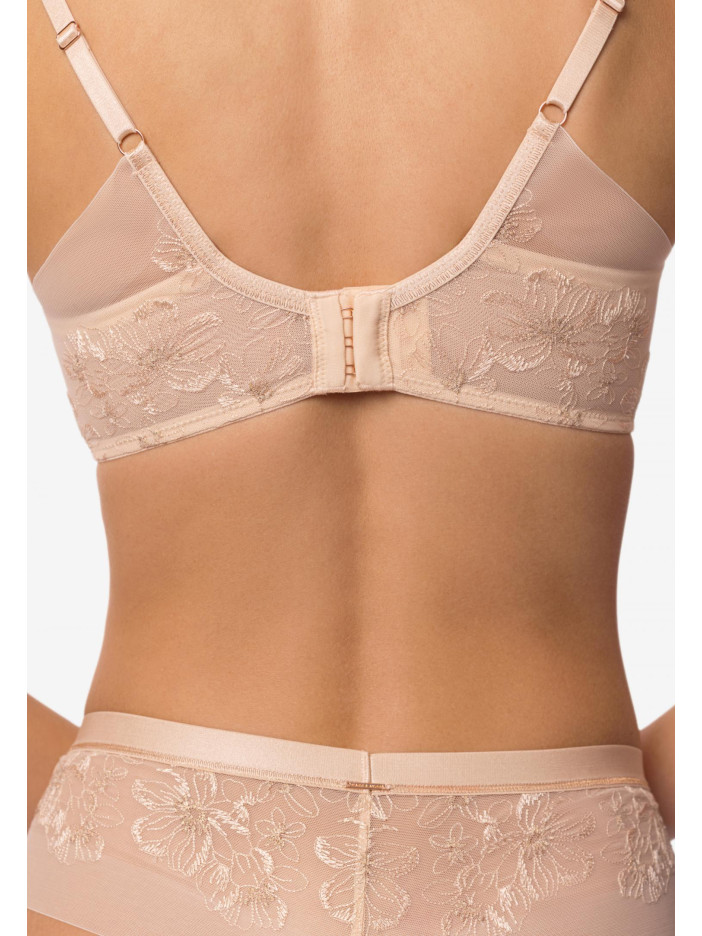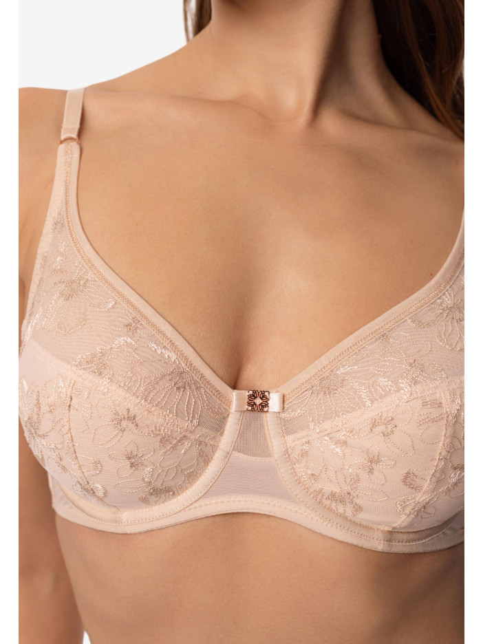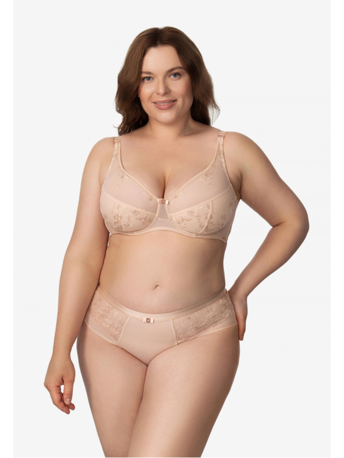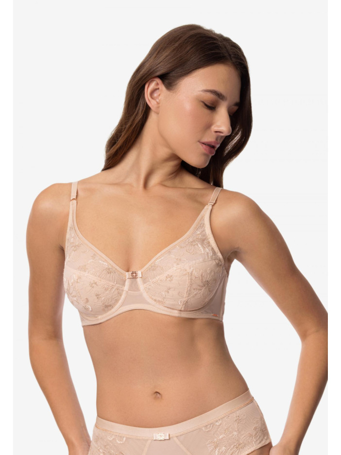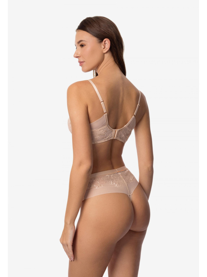 Серія SERENE — втілення внутрішньої гармонії та легкості. Вироби колекції прикрашені вишуканою вишивкою в нюдовому відтінку з тонким мерехтінням золотистої нитки. Ці витончені деталі створюють відчуття легкості та природної елегантності. Серія створена для тих, хто цінує легкість, витонченість і м'яке сяйво в образах. М'який бюстгальтер на каркасній підтримці ідеально поєднує комфорт і стиль. Сітчасті чашки з витонченою вишивкою делікатно обрамляють груди, а поєднання м'якої бавовни і легкої сітки забезпечує ідеальну посадку. Бічні кісточки підтримують форму, не обмежуючи рухи, а тонка вишивка на сітчастій підкладці додає вишуканий штрих. Легкість, комфорт і витончена краса в одному виробі. SERENE — це легкість, впевненість і витончена жіночність у кожній лінії.
