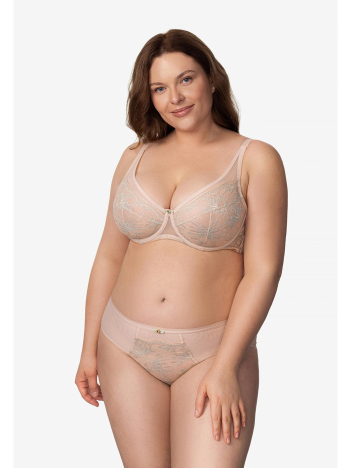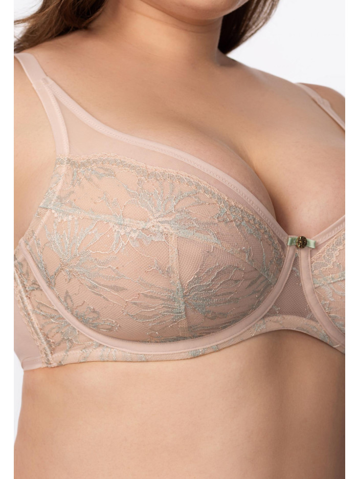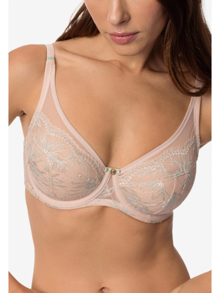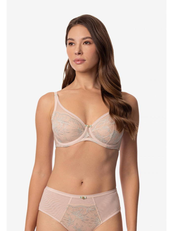 Серія ANTOINETTE — це елегантне мереживо в м'яких тонах, легке і прозоре на приємній основі. Ніжно-рожевий колір з м'ятними акцентами додає свіжості образу. ANTOINETTE поєднує легкість і виразність, об'єднуючи делікатність і впевненість. Бюстгальтер з м'якою чашкою на каркасній підтримці — втілення витонченості і комфорту. Внутрішня частина чашки дубльована еластичною сіткою, що забезпечує м'якість і надійну посадку. Зовні чашки покриті витонченим мереживом, яке надає образу легкість і романтичність. Стан з мережива на підкладці з сітки створює делікатний баланс між прозорістю і підтримкою. Бічні підсилюючі кісточки і кругла спинка гарантують комфортне прилягання і ідеальну форму протягом усього дня.