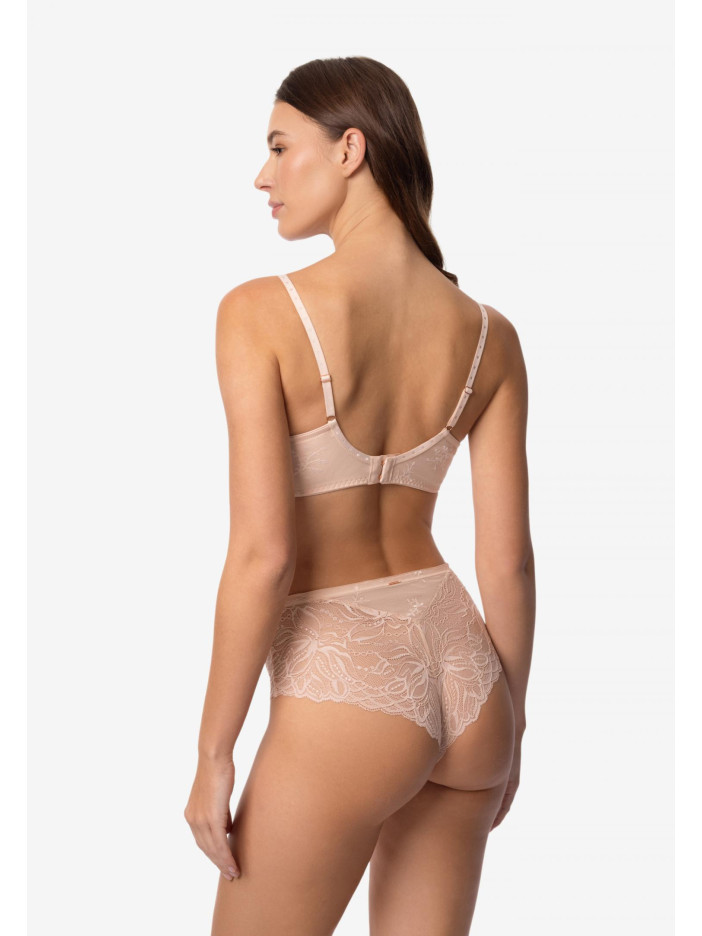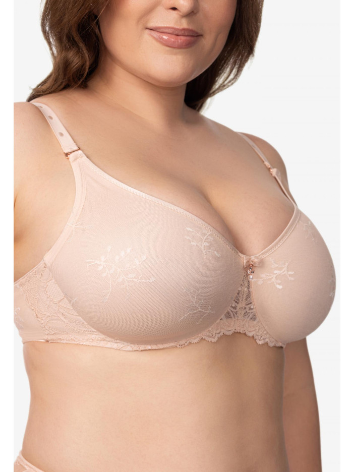ESSENCE — це чуттєве втілення літа: легке, тепле і надихаюче. В основі серії — м'який нюдовий відтінок, що дарує відчуття спокою і затишку. Його відтіняють золоті і перлинні акценти, наповнені сяйвом і оптимізмом. Ця гармонія кольорів відображає настрій літа — коли день яскравий, а ніч ніжна. Бюстгальтер з м'якою чашкою на кісточках. Всередині чашка дубльована мікрофіброю. Бретелі відстібаються спереду. Верхній край чашок по лінії декольте декорований еластичною тасьмою. Бічні деталі з мережива на підкладці для додаткової підтримки. Кругла комфортна спинка. Широкий розмірний ряд, бюстгальтер прекрасно підійде власницям пишних форм