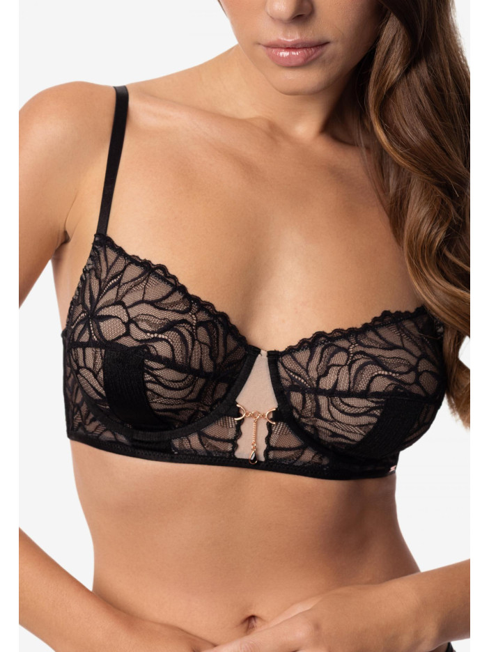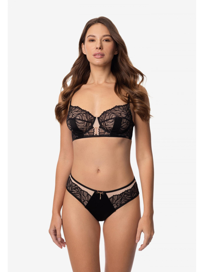 У серії LE MYSTÈRE ми поєднали м'якість і силу, ніжність і контраст. Чорне мереживо поєднується з нюдовою сіткою, а графічні канти з мікрофібри додають чіткості, зберігаючи легкість і делікатність. LE MYSTÈRE — для тих, хто цінує баланс і сміливість самовираження. Елегантний бюстгальтер з м'якими чашками на каркасній підтримці поєднує комфорт і вишуканий стиль. Внутрішня поверхня чашок з еластичної сітки забезпечує ідеальну посадку, а зовні — мереживо з контрастною вертикальною вставкою з мікрофібри додає грації. Стан з мережива на сітчастій підкладці і бічні кісточки дарують підтримку і підкреслюють природну красу силуету.