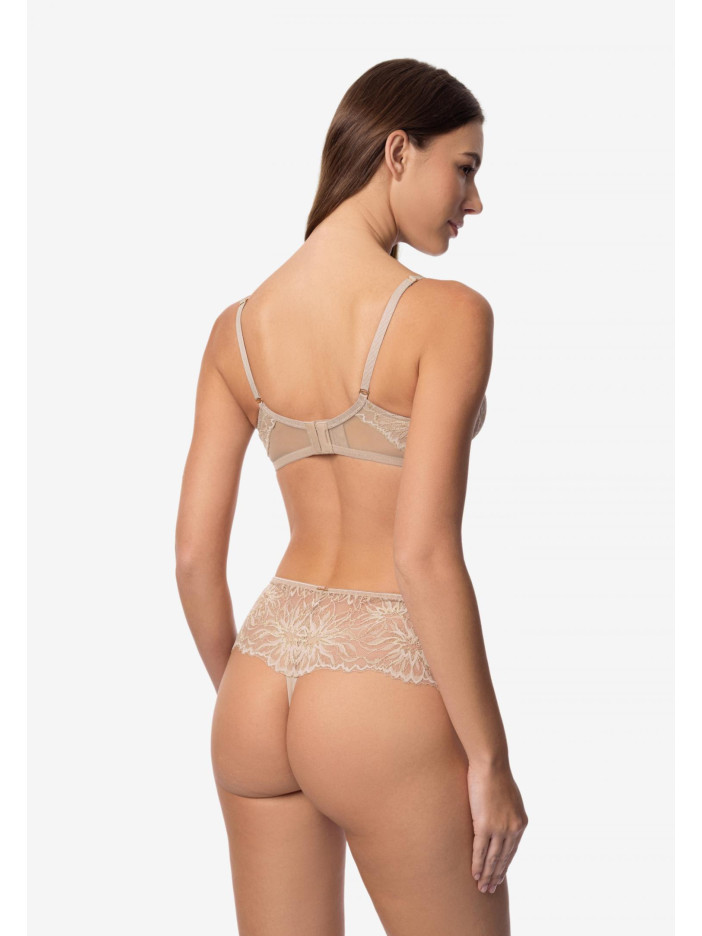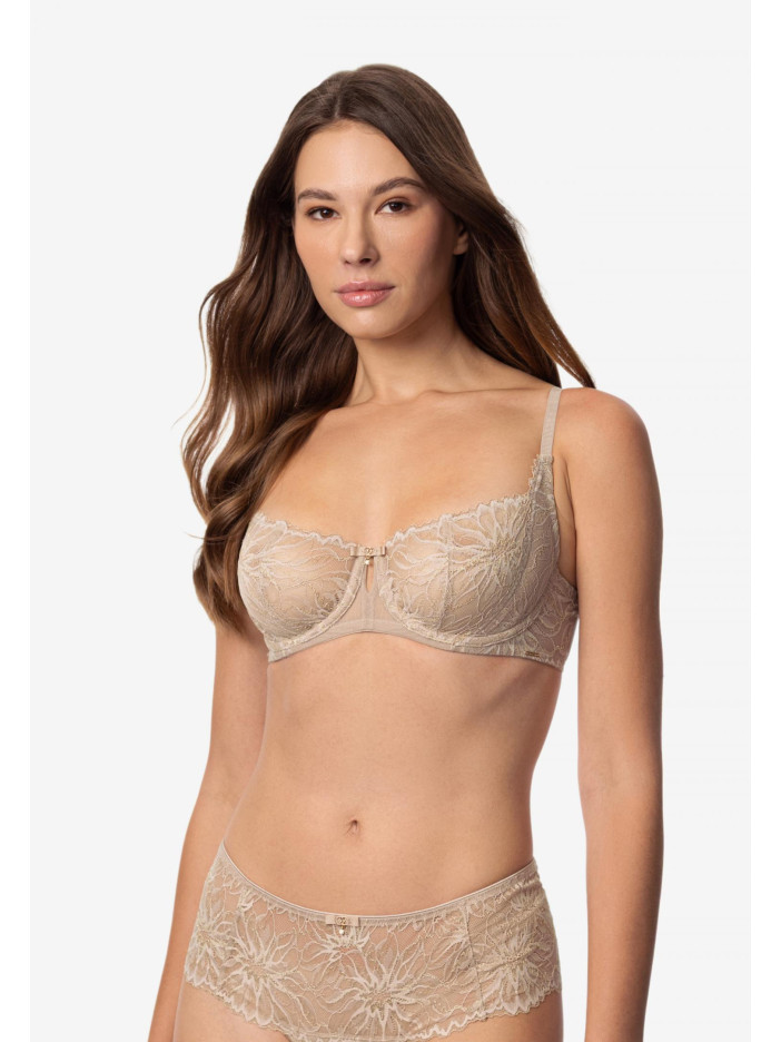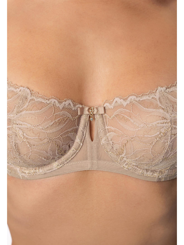Серія TINTED PASTELS — втілення витонченої класики: м'яке сяйво, легкість і вишукана виразність. Мереживо в відтінку light taupe з делікатним блиском рожевого золота створює елегантне поєднання, що підкреслює жіночність. Золота нитка м'яко грає на світлі, даруючи особливе сяйво, а шовковиста текстура підкреслює природну грацію і витонченість кожної деталі. Бюстгальтер з м'якими мереживними чашками на каркасній підтримці поєднує комфорт і вишуканість. Чашки виконані з ніжного мережива, бічні вставки дубльовані еластичною сіткою для ідеальної посадки. Стан з еластичної сітки прикрашений витонченим мереживом, створюючи гармонійний і жіночний образ.