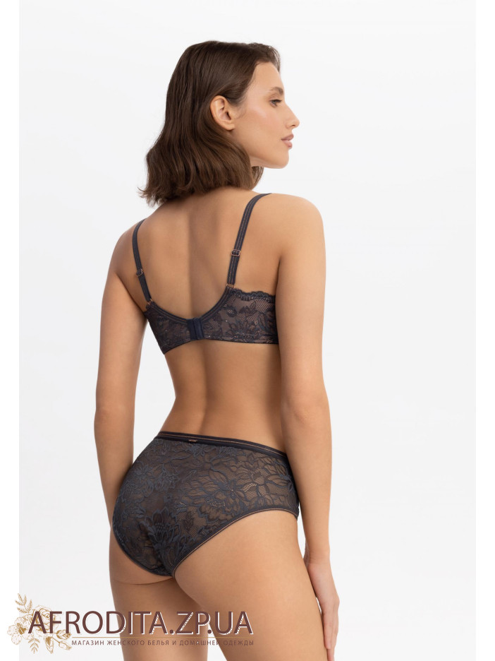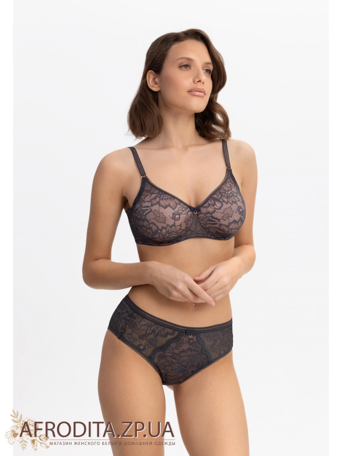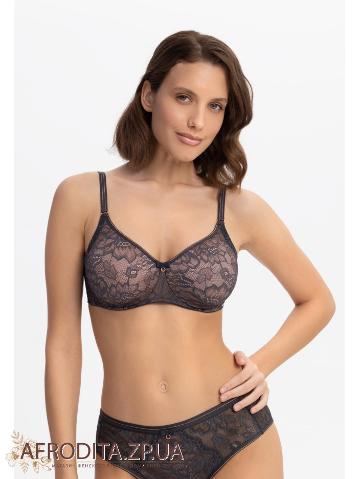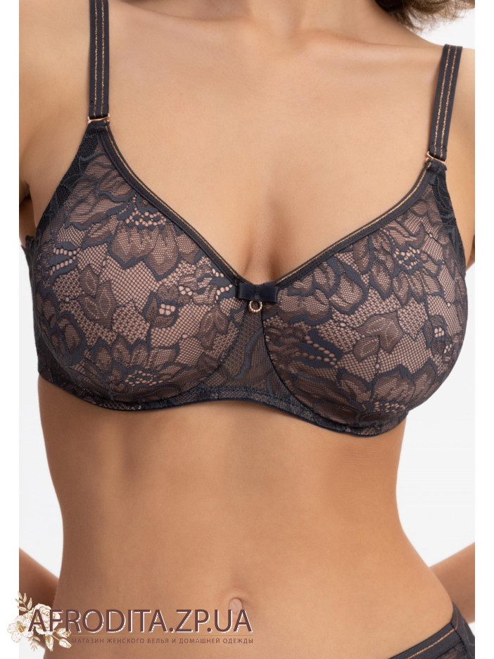 Бюстгальтер з м'якою чашкою на кісточках. Всередині чашка дубльована мікрофіброю. Бретелі відстібаються спереду. Верхній край чашок по лінії декольте декорований еластичною тасьмою з вплетінням металізованої нитки кольору rose gold. Бічні деталі з мережива на підкладці для додаткової підтримки. Кругла комфортна спинка. Широкий розмірний ряд, бюстгальтер прекрасно підійде власницям пишних форм.