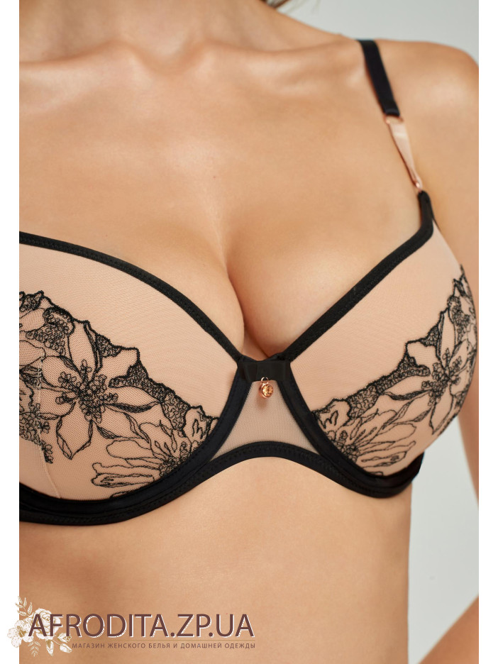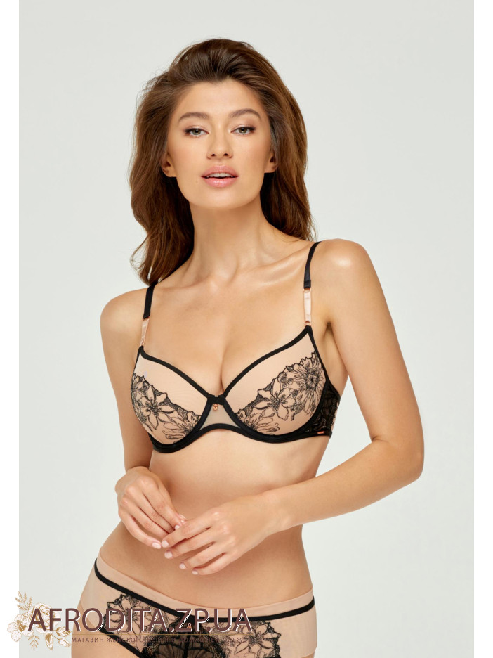 Бюстгальтер на каркасній підтримці з формованою чашкою і вбудованим «пуш-ап». Оздоблення чашок сіткою і вишивкою. Стан на підкладці. Регульовані бретелі. Декор - сатиновий бантик і медальйон. Труси-бразиліана з середньою лінією талії. Пояс з подвійною сітки. Передня деталь з еластичного мережива в поєднанні з вишивкою. Задня деталь: поєднання мережива і еластичної сітки.