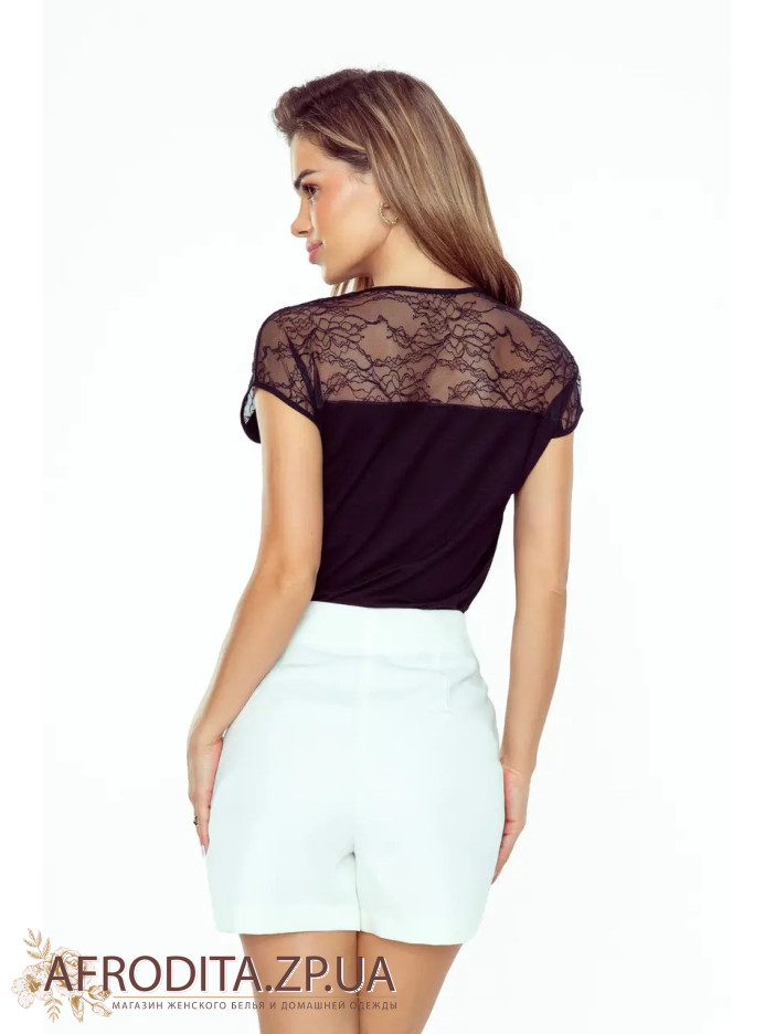 Жіноча футболка-блузка з короткими рукавами Mitzi від польської торгової марки ELDAR. Футболка виготовлена з м'якої віскози з додаванням еластану. Блузка вільного крою, верх виробу, рукави та спинка прикрашені мереживним полотном у тон виробу. Дана модель відмінно підходить як для повсякденного користування, так і для вечірнього виходу.